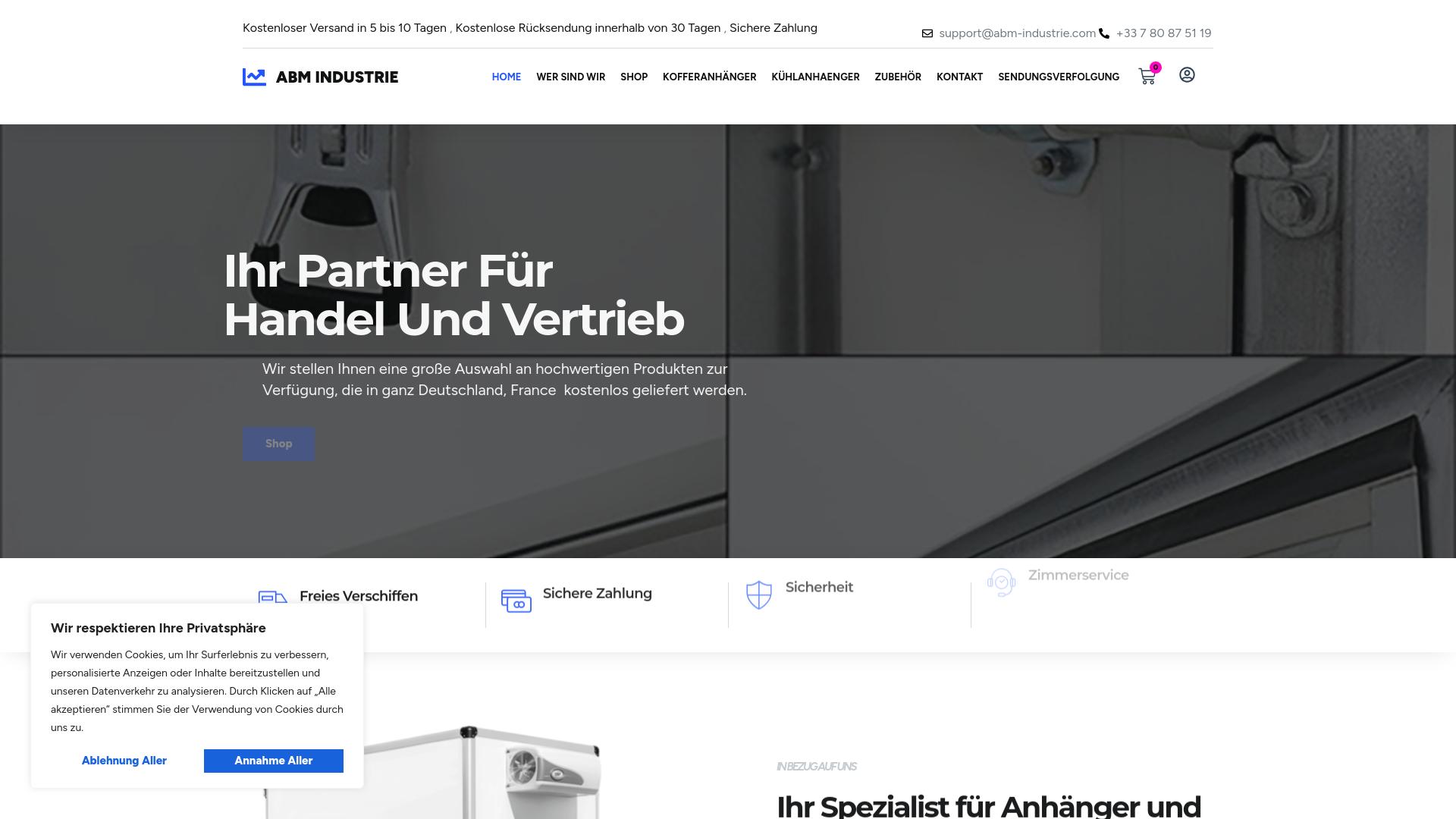 Die Webseite „ABM Industrie“ präsentiert sich als Anbieter von Produkten im Bereich Handel und Vertrieb. Auf der Seite wird eine breite Auswahl an hochwertigen Produkten hervorgehoben, die nach Deutschland und Frankreich geliefert werden können. Unter dem Menüpunkt „Shop“ sind verschiedene Produktkategorien zu finden, darunter Kofferanhänger, Kühlanhänger und Zubehör. Die genaue Produktpalette wird nicht detailliert beschrieben, jedoch wird angedeutet, dass die angebotenen Artikel für unterschiedliche Anwendungen im Handel geeignet sind. Die Webseite betont verschiedene Dienstleistungen, wie eine kostenlose Versandoption innerhalb eines Zeitraums von fünf bis zehn Tagen sowie die Möglichkeit der kostenlosen Rücksendung innerhalb von 30 Tagen. Des Weiteren wird auf eine sichere Zahlungsmethode hingewiesen, was in der Regel ein wichtiges Kriterium für Online-Käufe ist. Ein weiterer Aspekt der Seite ist der Hinweis auf Datenschutz, wofür die Verwendung von Cookies erwähnt wird. Dies soll den Nutzern ermöglichen, ihr Surferlebnis zu verbessern und personalisierte Inhalte anzuzeigen. Für Kontaktanfragen sind auf der Webseite eine E-Mail-Adresse sowie eine Telefonnummer angegeben, was eine direkte Kommunikation ermöglicht. Zusätzlich wird ein Bereich angeboten, um Sendungen nachverfolgen zu können, was für Kunden von Bedeutung ist, um den Status ihrer Bestellungen zu überprüfen. Insgesamt bietet die Webseite eine Plattform für den Online-Kauf von spezifischen Ausstattungen und Verbrauchsgütern, die potenziell für Händler und Vertriebsunternehmen von Interesse sind. Die Gestaltung der Seite wirkt modern und ansprechend, mit einem Fokus auf Klarheit und Benutzerfreundlichkeit.
