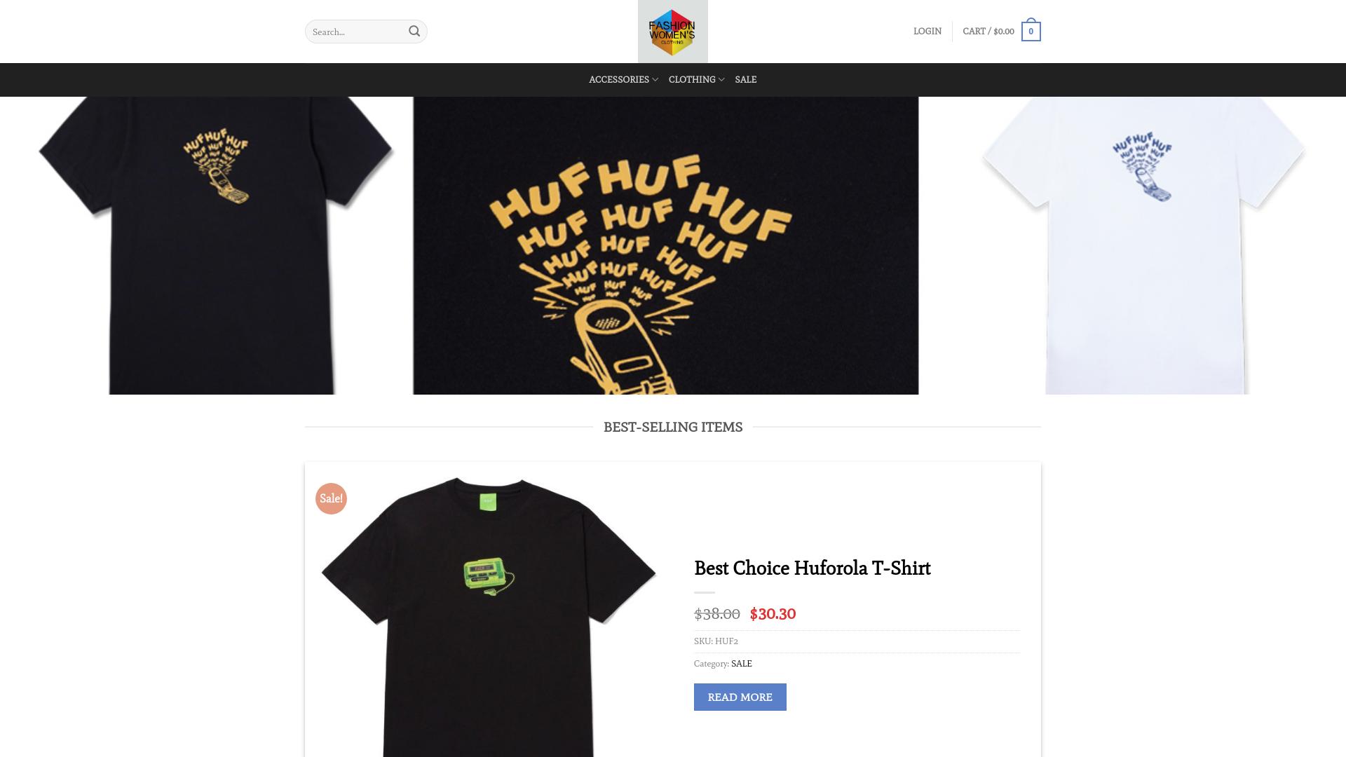 Die Webseite bietet eine Auswahl an Bekleidungsartikeln, insbesondere T-Shirts, die durch verschiedene Designs gekennzeichnet sind. Diese Designs zeigen beispielsweise grafische Darstellungen in Form von Texten und Illustrationen, die auf die Marke oder das Thema hinweisen. Es sind überwiegend T-Shirts in zwei verschiedenen Farbvarianten zu sehen: eine schwarze und eine weiße Variante. Ein spezifisches Produkt, das hervorgehoben wird, ist das sogenannte „Best Choice Huforola T-Shirt“. Dieses T-Shirt wird zu einem reduzierten Preis angeboten, wobei der ursprüngliche Preis höher angegeben ist. Die Seite zeigt sowohl den ehemaligen Preis als auch den rabattierten Preis, was darauf hinweist, dass weiterhin Verkaufsförderung betrieben wird. Unter dem Produkt befindet sich ein Link, der mit „READ MORE“ bezeichnet ist, was darauf hindeutet, dass weitere Informationen über dieses Produkt zur Verfügung stehen. Insgesamt wird in dem oberen Bereich der Seite eine Auswahl an „Best-Selling Items“ angepriesen, was darauf hinweist, dass es eine Kategorie von meistverkauften Artikeln gibt. Die Gestaltung der Seite umfasst auch Menüpunkte für „Accessories“, „Clothing“ und „Sale“, die den Nutzern helfen, Produkte gezielt nach Kategorien zu durchsuchen. Die Benutzeroberfläche der Webseite scheint einfach und übersichtlich zu sein, mit der Möglichkeit, Artikel in einen Warenkorb zu legen. Oben auf der Seite ist ein Suchfeld zu finden, das es Nutzern ermöglicht, nach spezifischen Produkten zu suchen. Es gibt auch die Möglichkeit, sich anzumelden oder ein Konto zu erstellen, was auf ein benutzerorientiertes Einkaufserlebnis hinweisen könnte. Die Webseite hat ein modernes Design, welches die dargestellten Produkte ansprechend präsentiert. Es ist jedoch unklar, ob es sich um eine offizielle Verkaufsplattform handelt oder ob die Markenrechte an den abgebildeten Designs ordnungsgemäß berücksichtigt werden. Die Stapelung der Produkte und die Verwendung von Farben scheinen darauf abzuzielen, die Neugier der Nutzer zu wecken und sie zum Durchstöbern der Angebote anzuregen.