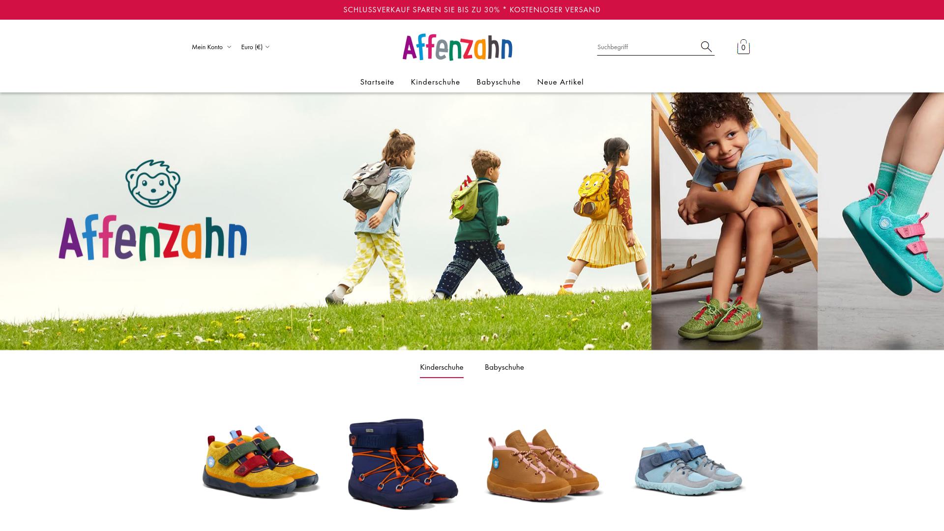 Die Webseite „Affenzahn“ bietet eine Auswahl an Schuhen für Kinder und Babys an. Im oberen Bereich der Seite wird das Logo der Marke gezeigt, das ein stilisiertes Affengesicht darstellt. Unter dem Logo finden sich verschiedene Navigationspunkte, über die die Hauptkategorien der Webseite zugänglich sind: „Startseite“, „Kinderschuhe“, „Babyschuhe“, „Neue Artikel“ sowie ein Suchfeld. Die Seite präsentiert sich visuell ansprechend mit Fotos von Kindern, die in einer natürlichen Umgebung spielen und die angebotenen Produkte tragen. Diese Bilder vermitteln ein Gefühl von Aktivität und Outdoor-Erlebnissen. In der Produktkategorie „Kinderschuhe“ werden verschiedene Modelle angezeigt, die speziell für die Bedürfnisse von Kindern entworfen sind. Diese reichen von sportlichen bis hin zu modischen Designs, die möglicherweise für verschiedene Anlässe geeignet sind. Die Schuhe scheinen in unterschiedlichen Farben und Größen erhältlich zu sein. Die Kategorie „Babyschuhe“ bietet ebenfalls eine Auswahl an Schuhen für jüngere Kinder. Hier werden Modelle vorgestellt, die wahrscheinlich speziellen Anforderungen hinsichtlich Komfort und Sicherheit während der Wachstumsphase der Füße entsprechen. Zusätzlich scheint die Webseite aktuell einen „Schlussverkauf“ anzubieten, mit einem Hinweis auf Preisnachlässe von bis zu 30%. Die Versandbedingungen sind ebenfalls im oberen Bereich der Seite erwähnt, wobei angegeben wird, dass der Versand kostenlos ist. Es gibt eine Konto-Option für Nutzer, um sich anzumelden oder ein Konto zu erstellen, was vermuten lässt, dass eine Funktion zur Verwaltung von Bestellungen oder die Speicherung von bevorzugten Produkten vorgesehen ist. Die Webseite legt ihren Fokus auf die Zielgruppe von Eltern und deren Kindern, die nach qualitativ hochwertigen und ansprechenden Schuhen suchen. Sie bietet zudem die Möglichkeit für Nutzer, neue Artikel einzusehen, was darauf hindeutet, dass regelmäßig neue Produkte hinzukommen.