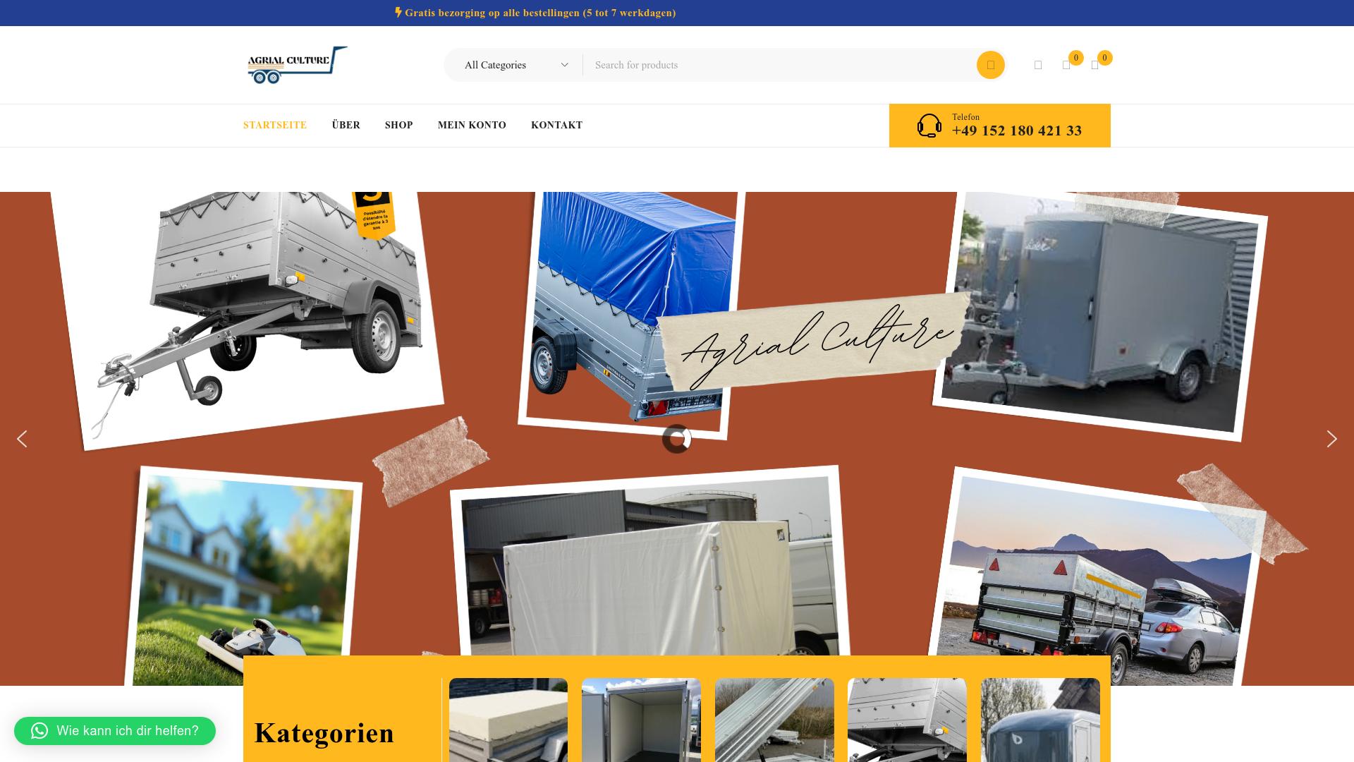 Die Webseite bietet eine Übersicht über eine Auswahl an Anhängern und Zubehör für landwirtschaftliche Anwendungen. Auf der Startseite werden verschiedene Arten von Anhängern präsentiert, die zur Beförderung von Gütern und Materialien geeignet sind. Diese Anhänger erscheinen in unterschiedlichen Größen und Ausführungen, inklusive geöffneten und geschlossenen Varianten. Die visuellen Darstellungen auf der Seite zeigen verschiedene Modelle, die sowohl für den privaten als auch für den professionellen Einsatz gedacht sind. Die Bilder sind auffällig und zeigen die Anhänger in unterschiedlichen Umgebungen, unter anderem auf landwirtschaftlichen Flächen und in urbanen Regionen. Zusätzlich gibt es eine strukturierte Navigation, die dem Nutzer die Möglichkeit gibt, durch verschiedene Kategorien zu browsen. Neben den Anhängern wird auch wohl Zubehör gezeigt, das möglicherweise für den Betrieb oder die Nutzung der Anhänger nützlich ist. Es wird ein Kontaktbereich angegeben, in dem Nutzer Fragen stellen oder Unterstützung anfordern können. Die Webseite enthält auch eine Telefonnummer für telefonische Anfragen. Auf der Website wird zudem deutlich, dass der Anbieter eine schnelle Lieferung innerhalb einer bestimmten Zeitspanne anbietet. Diese Information könnte für Nutzer von Interesse sein, die eine zeitnahe Lieferung der Produkte wünschen. Insgesamt legt die Seite einen Fokus auf die Präsentation von Produkten und bietet umfassende Informationen über die verfügbaren Anhänger und möglicherweise verwandte Dienstleistungen. Die Kategorisierung der Produkte und der zugängliche Kontaktbereich sollen darauf abzielen, den Besuchern eine einfache Navigation und Informationsaufnahme zu ermöglichen.