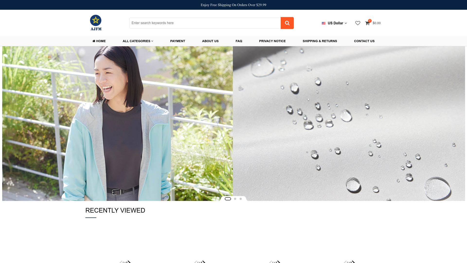 Die angegebene Webseite zeigt eine Vielzahl von Produkten, die im Bereich Bekleidung und Accessoires kategorisiert sind. Die Hauptnavigation enthält verschiedene Kategorien, die den Nutzern die Suche nach bestimmten Artikeln erleichtern sollen. Zu den angebotenen Produkten gehören Outdoor-Bekleidung sowie Freizeitmode, die für unterschiedliche Aktivitäten und Wetterbedingungen geeignet sein könnten. Die Startseite präsentiert ein Bild, auf dem eine Person mit einer hellen Jacke zu sehen ist, was darauf hindeutet, dass die Produkte möglicherweise für sportliche oder saisonale Aktivitäten konzipiert sind. Zusätzlich wird ein Bild angezeigt, das Wassertropfen auf einem glänzenden Stoff zeigt, was möglicherweise die wasserabweisenden oder -festen Eigenschaften der Produkte symbolisiert. Die Webseite bietet darüber hinaus Informationen zu den Bezahlmethoden, die für den Einkauf genutzt werden können, sowie zu Rückgabe- und Versandrichtlinien, die potenziellen Käufern einen Überblick über die Bedingungen der Bestellungen geben. Ein FAQ-Bereich ist ebenfalls vorhanden, der häufig gestellte Fragen zu Produkten, Bestellungen und dem Kundendienst beantwortet. In der Fußzeile der Webseite finden sich weiterführende Links, darunter Informationen zum Unternehmen, Datenschutzrichtlinien sowie Kontaktdaten für Kundensupport-Anfragen. Es gibt auch eine Rubrik für zuletzt angesehene Produkte, die den Nutzern helfen kann, schnell auf zuvor betrachtete Artikel zuzugreifen. Zusammenfassend zeigt die Webseite eine Vielzahl von Bekleidungsprodukten mit einem Fokus auf Outdoor-Aktivitäten und bietet Informationen zu Einkauf und Kundenservice. Es wird eine klare Struktur zur Navigation über die verschiedenen Kategorien und zur Unterstützung der Nutzer beim Einkaufen angeboten.