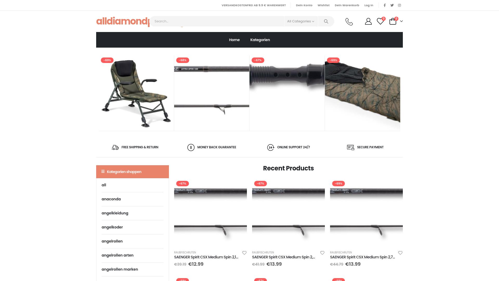 Die Webseite „alldiamond“ bietet eine Auswahl an Produkten, die hauptsächlich im Bereich Angeln und Outdoor-Ausrüstung angesiedelt sind. Auf der Startseite sind verschiedene Kategorien sichtbar, durch die Nutzer navigieren können. Zu den angebotenen Produktkategorien zählen unter anderem Angelruten, Angelzubehör und verschiedene Arten von Camping- und Freizeitmöbeln. Im oberen Bereich der Webseite werden prominent einige Produkte angezeigt, die erhebliche Preisnachlässe aufweisen. Zum Beispiel sind eine Campingliege im Tarnmuster sowie mehrere Modelle von Angelruten aufgelistet, die mit Rabatten von bis zu 69 % beworben werden. Die Bilddarstellungen geben einen Überblick über die jeweiligen Artikel, wobei Farbtöne und Designs jeweils erkennbar sind. Zusätzlich gibt es Angaben zu den Lieferbedingungen, einschließlich „kostenloser Versand und Rückgabe“, sowie eine Geld-zurück-Garantie und die Verfügbarkeit von Online-Support rund um die Uhr. Diese Informationen befinden sich in unmittelbarer Nähe zur Produktübersicht und sollen anscheinend die Benutzererfahrung verbessern. Die Navigation der Webseite ist einfach gestaltet, und Nutzer können zwischen verschiedenen Kategorien wählen, um die Suche nach spezifischen Produkten zu erleichtern. Diejenigen, die an bestimmten Marken oder Produkttypen interessiert sind, können die Produkte auch nach Marke sortieren. Dies wird durch eine klare Menüleiste unterstützt, die verschiedene Filteroptionen anbietet. Insgesamt konzentriert sich die Webseite darauf, ein breites Spektrum an Produkten für Interessierte im Outdoor- und Angelbereich anzubieten, während sie die Benutzerfreundlichkeit durch ein ansprechendes Design und einfache Navigation fördern möchte.