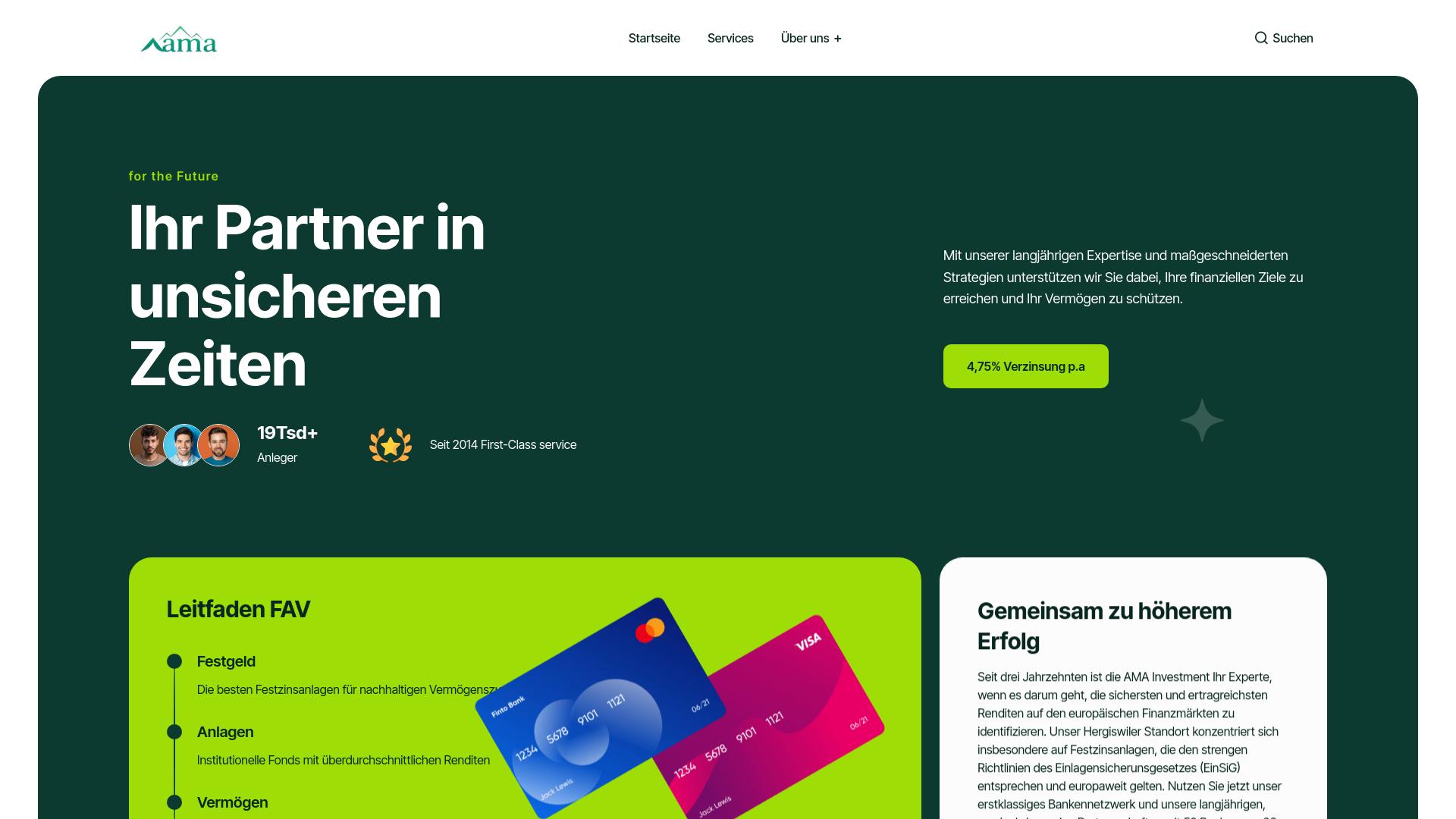 Die Webseite bietet Informationen und Dienstleistungen im Bereich der Geldanlage und Vermögensverwaltung an. Sie positioniert sich als Partner für Anleger, insbesondere in unsicheren Zeiten, und hebt die Expertise des Unternehmens seit 2014 hervor. Laut Angaben auf der Seite haben über 19.000 Anleger Vertrauen in die angebotenen Dienstleistungen gesetzt. Im Mittelpunkt der Webseite stehen verschiedene Finanzprodukte und Strategien zur Vermögenssicherung und -vermehrung. Die Kategorie „Festgeld“ wird erwähnt, wobei hier auf attraktive Festzinsanlagen verwiesen wird, die für nachhaltige Vermögensziele geeignet sein sollen. Hierzu werden möglicherweise unterschiedliche Angebote vorgestellt, die eine feste Verzinsung über einen bestimmten Zeitraum versprechen. Außerdem wird auf die Möglichkeit von Anlagen in institutionelle Fonds hingewiesen, die überdurchschnittliche Renditen erzielen sollen. Solche Fonds sind typischerweise so strukturiert, dass sie institutionellen Anlegern, wie Pensionsfonds oder großen Unternehmen, zugänglich sind. Die Webseite bietet zudem Anleitungen und Informationen zu den Anlagemöglichkeiten, um potenziellen Anlegern zu helfen, die für sie geeigneten Optionen zu finden. Ein spezifischer Zinssatz von 4,75 % pro Jahr wird erwähnt, jedoch wird keine detaillierte Erklärung zu den Bedingungen oder dem Zeitraum gegeben, unter denen dieser Zinssatz erzielt werden kann. Darüber hinaus wird in einem Untertitel auf die Einhaltung der Richtlinien des Einlagensicherungsgesetzes (EinSiG) hingewiesen, was auf eine entsprechende Regulierung hinweisen könnte. Die Webseite umfasst auch eine Sektion, die sich mit der gemeinsamen Erfolgssicherung beschäftigt, was darauf hindeutet, dass das Unternehmen Wert auf langfristige Beziehungen zu seinen Kunden legt. Es sind visuelle Darstellungen von Kreditkarten, möglicherweise im Zusammenhang mit den angebotenen Finanzdienstleistungen, zu sehen. Zusammenfassend handelt es sich um eine Plattform, die Finanzdienstleistungen und Anlagemöglichkeiten präsentiert, mit einem Fokus auf Festgeldanlagen und institutionelle Fonds, um den Nutzern zu helfen, ihre Vermögensziele zu erreichen und abzusichern.