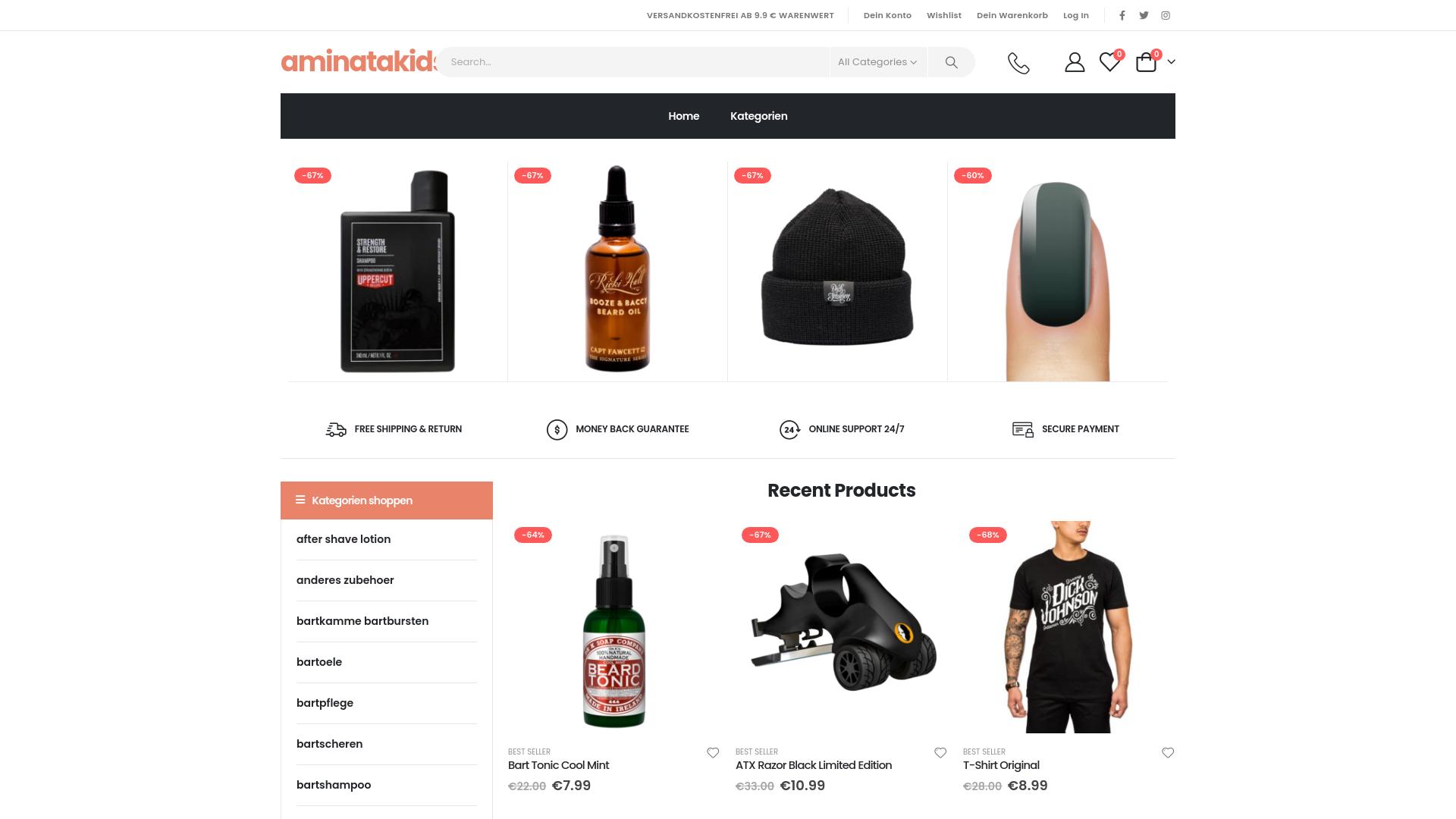 Die Webseite aminatakid.com bietet eine Vielzahl von Produkten, die hauptsächlich auf persönliche Pflege und Styling ausgerichtet sind. In der oberen Navigationsleiste haben Nutzer die Möglichkeit, zwischen verschiedenen Kategorien zu wählen, darunter „after shave lotion“, „Bartpflege“, „Bartpflegeprodukte“, „Bartshampoos“ und weiteres Zubehör. Die Produktauswahl beinhaltet Pflegeartikel für Bart und Haut, sowie unterschiedliche Ausstattungen für Männer. Auf der Hauptseite sind verschiedene Produkte abgebildet, darunter Bartöl, ein Shampoo und eine Kopfbedeckung. Jedes Produkt ist mit einem Preis versehen, aus dem ersichtlich ist, ob es sich um einen reduzierten Preis handelt. Zum Beispiel wird ein Bartöl mit 67 % Rabatt angeboten, ebenso wie ein Shampoo. Die Seite hebt Angebote wie „Kostenloser Versand und Rückgabe“ sowie „Geld-zurück-Garantie“ hervor, was potenziell für Kunden von Interesse sein könnte. Des Weiteren werden in einer Rubrik „Neueste Produkte“ jüngst hinzugefügte Artikel angezeigt. Hierzu zählen Pflegeprodukte wie ein „Bart Tonic Cool Mint“ und ein „ATX Razor Black Limited Edition“ Rasierer, die ebenfalls mit deutlichen Preisreduzierungen versehen sind. Ein T-Shirt wird ebenfalls angeboten. Die Webseite beschreibt, dass Unterstützung rund um die Uhr verfügbar ist und unterstreicht den Aspekt der sicheren Zahlung. Die weiteren Optionen, auf die Nutzer zugreifen können, sind die Möglichkeit, ein Benutzerkonto zu erstellen, eine Wunschliste zu führen und einen Warenkorb zu nutzen, um Artikel zu speichern für einen späteren Kauf. Die Kategorisierung der Produkte scheint klar und benutzerfreundlich gestaltet, sodass Nutzer schnell das Gesuchte finden können. Auch die grafische Gestaltung der Seite wirkt übersichtlich, wobei große Produktbilder und klare Preisangaben im Vordergrund stehen. Die benutzerfreundliche Navigation und die sichtbaren Rabatte könnten für einen breiten Verbraucherkreis ansprechend sein. Insgesamt bietet die Webseite eine Sammlung von Produkten, die sich auf die Pflege und das Styling männlicher Kunden fokussiert, ohne dabei spezifische Marken oder Hersteller zu kennzeichnen.