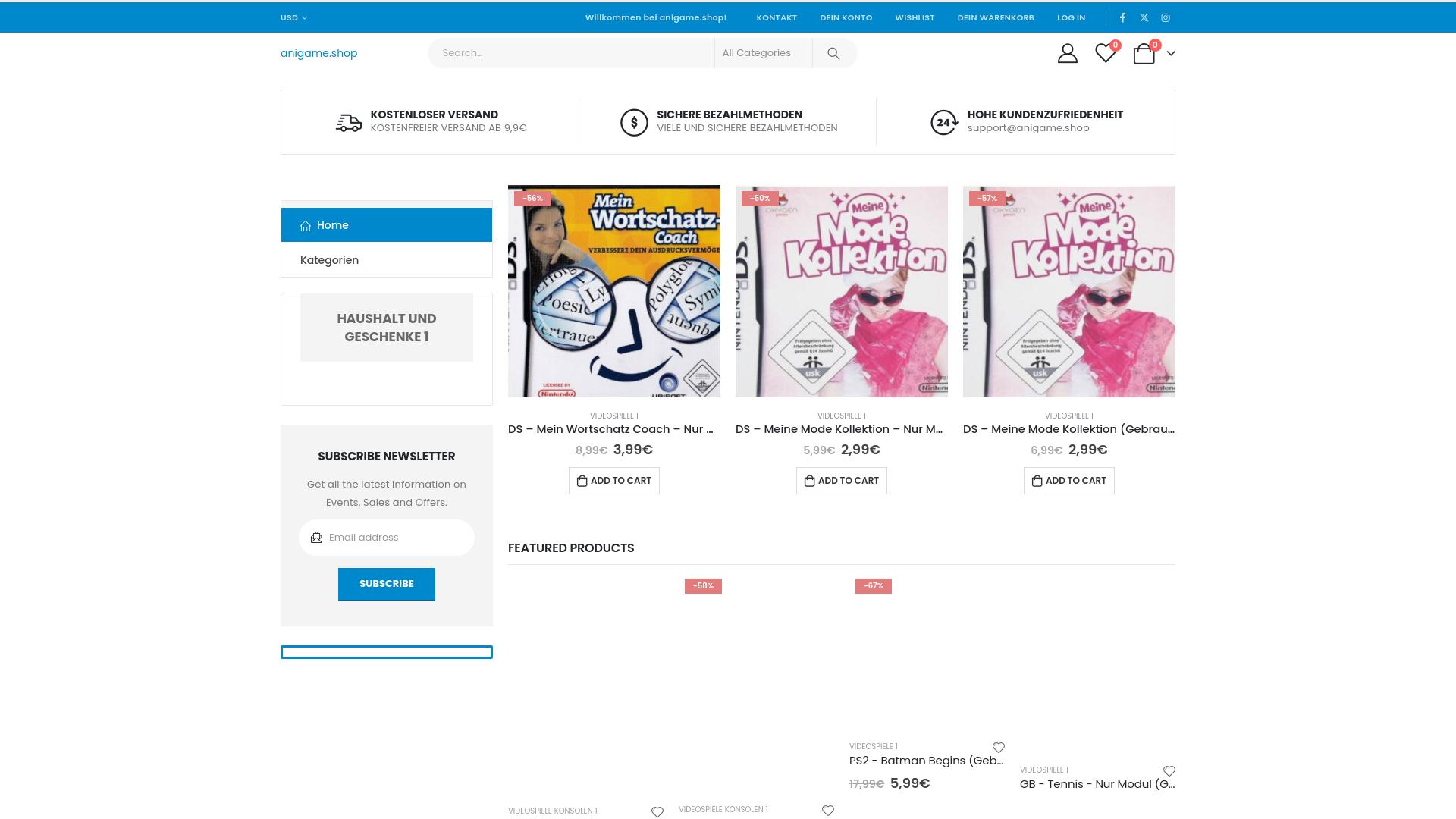 Die Webseite anigame.shop bietet eine Auswahl an Produkten, die sich hauptsächlich auf Videospiele konzentriert. Der Schwerpunkt liegt auf gebrauchten und neuen Spielen für verschiedene Konsolen. Auf der Startseite werden mehrere Produkte prominent dargestellt, darunter Titel für den Nintendo DS und die PlayStation 2. Zu den angezeigten Produkten gehören unter anderem „Mein Wortschatz Coach“ und „Meine Mode Kollektion“, beide für die Nintendo DS-Konsole. Diese Spiele sind zu reduzierten Preisen angeboten, wobei neben dem aktuellen Preis auch der Originalpreis vor der Ermäßigung angezeigt wird. Die Seite hebt einige Artikel mit besonderen Rabattaktionen hervor, was auf eine Verkaufsaktion hinweisen könnte. Zusätzlich zur Produktbeschreibung finden sich auf der Webseite Hinweise für den kostenlosen Versand, der ab einem Mindestbestellwert angeboten wird. Es wird zudem auf sichere Zahlungsmethoden verwiesen, was für potenzielle Käufer Informationen über die Zahlungsabwicklung bereithält. Die Nutzer haben die Möglichkeit, sich für einen Newsletter anzumelden, um Informationen über aktuelle Angebote und Veranstaltungen zu erhalten. Die Webseite verwendet eine strukturierte Navigation mit Kategorien, die den Besuchern helfen soll, gesuchte Produkte einfacher zu finden. Die durchgängige Verwendung von Rabatten sowie die Kennzeichnung von „Featured Products“ könnte darauf abzielen, das kaufinteressierte Publikum zu animieren, die angebotenen Artikel zu betrachten und zu erwerben. Insgesamt präsentiert die Webseite eine klare Auflistung von Videospielen, ergänzt durch Informationen zu Rabatten und Versandoptionen. Es wird ein Support-Service angeboten, der für Kundenanfragen zur Verfügung steht.