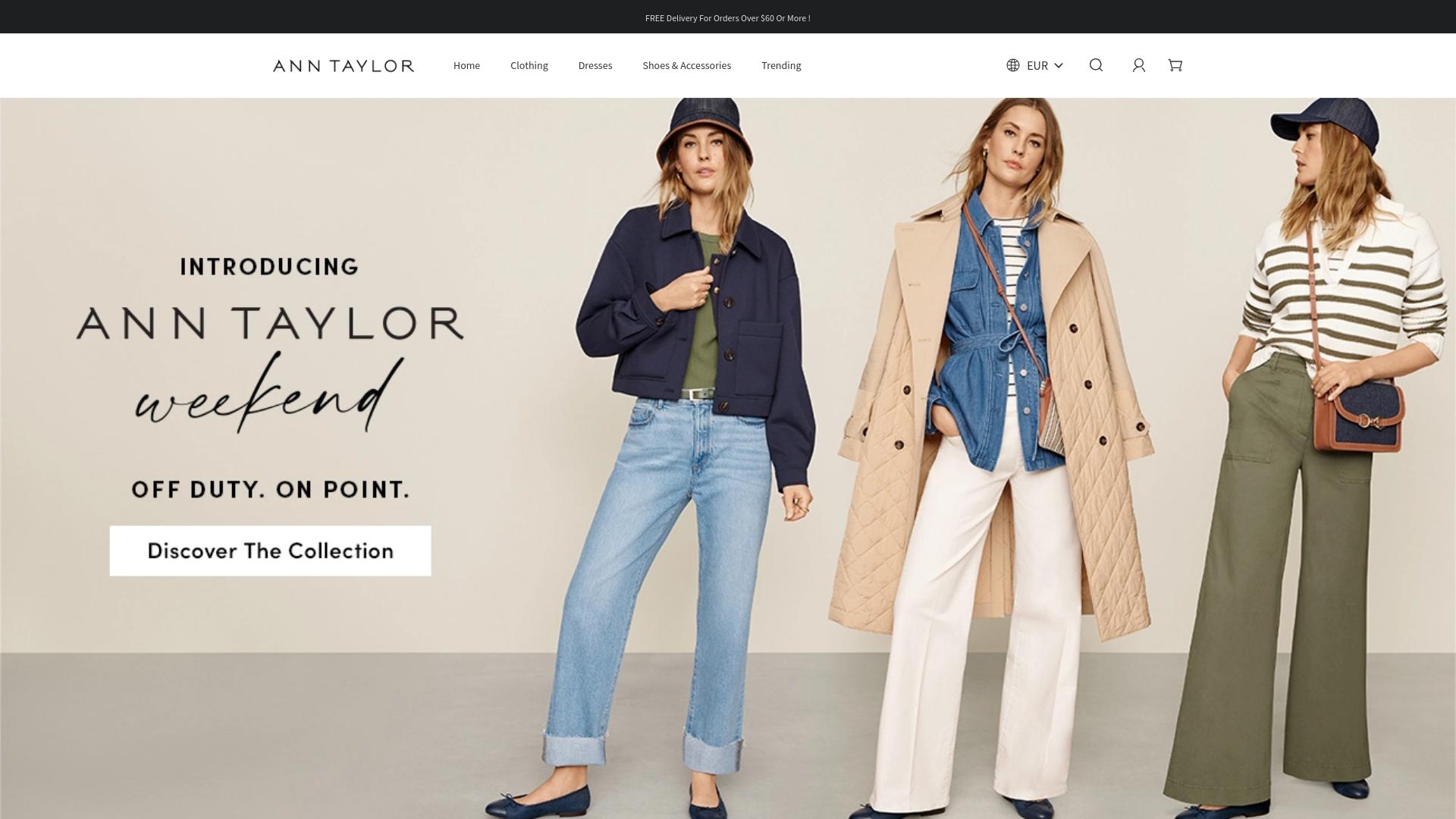Die Webseite bietet eine Auswahl an Damenbekleidung und Accessoires unter dem Markennamen „Ann Taylor“. Der Fokus liegt auf modischer Kleidung, die für verschiedene Anlässe geeignet ist, insbesondere Freizeit- und Alltagsoutfits. Zentrale Inhalte der Seite umfassen die Vorstellung einer neuen Kollektion, die unter dem Titel „Ann Taylor weekend“ beworben wird. Diese Kollektion könnte sich an Frauen richten, die praktische und stilvolle Kleidung für die Freizeit suchen. Auf der Webseite sind verschiedene Kleidungsstücke und Stilrichtungen zu sehen, darunter Oberteile, Hosen, Jacken und weitere Accessoires, die in unterschiedlichen Farben und Designs angeboten werden. Die Produktpräsentation beinhaltet zudem ansprechende visuelle Darstellungen von Modeln in den Kleidungsstücken, um die verfügbare Mode anschaulich zu inszenieren. Die Modelle sind in verschiedenen Kombinationen von Bekleidungsstücken zu sehen, was Besuchern helfen könnte, verschiedene Outfit-Ideen und Styling-Optionen zu finden. Zusätzlich wird darauf hingewiesen, dass es einen kostenlosen Versand für Bestellungen ab einem bestimmten Betrag gibt, was möglicherweise ein Anreiz für Käufer sein könnte. Die Webseite enthält auch Navigationspunkte, über die Kunden einfach durch verschiedene Kategorien wie Kleidung, Kleider und Schuhe sowie Accessoires navigieren können. Zielgruppen können modebewusste Frauen sein, die an aktuellen Modetrends interessiert sind und nach praktischen und vielseitigen Kleidungsstücken suchen. Die Webseite folgt allgemeinen E-Commerce-Praktiken und scheint darauf ausgerichtet zu sein, eine benutzerfreundliche Erfahrung zu bieten, um Kunden beim Online-Shopping zu unterstützen. Insgesamt bietet die Seite eine Vielzahl von Produkten, die im Kontext der dargestellten Kollektion präsentiert werden, ohne spezifische Bewertungen zur Qualität oder Vertrauenswürdigkeit der Produkte abzugeben.