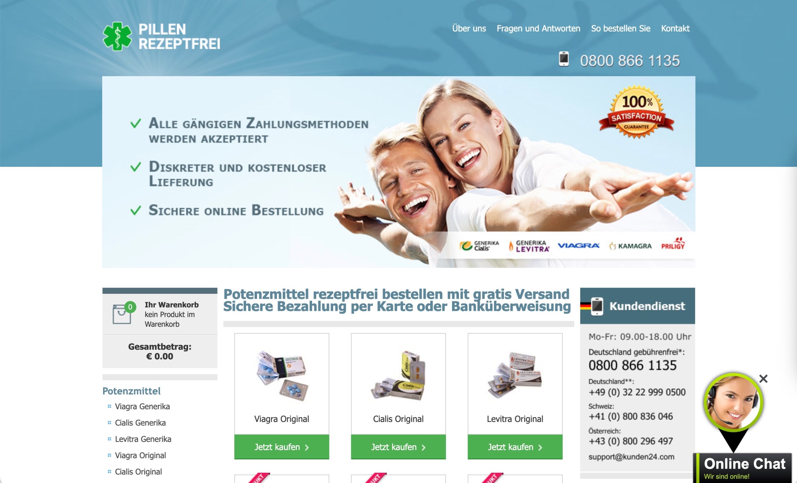 Die Webseite „Pillen rezeptfrei“ bietet den Nutzern die Möglichkeit, verschiedene Potenzmittel online zu bestellen. Auf der Hauptseite werden mehrere Produkte aufgeführt, darunter generische und originale Varianten von Viagra, Cialis und Levitra. Die Seite hebt hervor, dass die Bestellung rezeptfrei möglich ist und dass eine diskrete sowie kostenlose Lieferung angeboten wird. Über die Webseite können Interessierte direkt in einen Warenkorb Produkte hinzufügen und die Gesamtsumme einsehen. Es werden alle gängigen Zahlungsmethoden akzeptiert, einschließlich Bezahlung per Kreditkarte und Banküberweisung. Ein Kundenservice wird ebenfalls erwähnt, der telefonisch und über einen Online-Chat erreichbar ist. Die Webseite enthält Informationen zu den Öffnungszeiten des Kundenservice, der von Montag bis Freitag verfügbar ist. Zusätzlich wird auf der Webseite eine „100% Satisfaction Guarantee“ angezeigt, die Nutzer dazu anregen soll, die Produkte zu erwerben. Die Präsentation der Potenzmittel erfolgt visuell durch Produktabbildungen mit der Möglichkeit zur direkten Bestellung. Insgesamt ist die Webseite darauf ausgerichtet, einen schnellen und einfachen Zugang zu rezeptfreien Potenzmitteln zu ermöglichen, unterstützt durch verschiedene Zahlungsoptionen und einen Kundendienst.