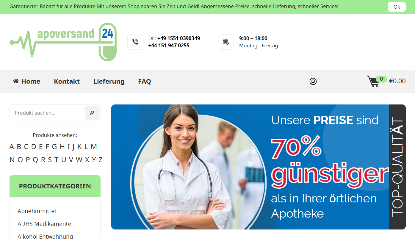 Die Webseite apoversand24 bietet eine Plattform, auf der Nutzer verschiedene Produkte aus den Bereichen Gesundheit und Wellness erwerben können. Die Hauptseite präsentiert eine Vielzahl von angebotenen Artikeln, darunter abnehmende Mittel, Medikamente zur Behandlung von ADHS und Produkte zur Unterstützung von Entwöhnungsprozessen von Alkohol. Die Webseite ermöglicht es Nutzern, gezielt nach spezifischen Produkten zu suchen und diese einzusehen. Eine Funktion der Webseite ist die Kategorisierung der Produkte, die in alphabetischer Reihenfolge angeordnet sind, was die Navigation erleichtert. Diese Kategorien umfassen unter anderem die bereits genannten Produktgruppen, sowie weitere gesundheitsbezogene Angebote. Die Produktinformationen sind in der Regel kurz gehalten und bieten einen Überblick über die jeweiligen Artikel. Darüber hinaus sind auf der Webseite Kontaktinformationen aufgeführt, einschließlich einer Telefonnummer mit internationaler Vorwahl, die Nutzern einen direkten Zugriff auf den Kundenservice ermöglicht. Die Servicezeiten sind von Montag bis Freitag angegeben, wobei die Verfügbarkeit der Unterstützung in den angegebenen Stunden gewährleistet wird. Zusätzlich bietet die Webseite Informationen zur Lieferung und eine FAQ-Sektion, die häufig gestellte Fragen der Nutzer adressieren soll. Auf der Startseite wird ein Rabattangebot beworben, das potenziell auf einen Preisvorteil hinweist, der beim Kauf der Produkte im Vergleich zu herkömmlichen Apotheken erzielt werden kann. Die Webseite legt Wert auf ein ansprechendes Design mit grafischen Elementen, die visuell die angebotenen Dienstleistungen unterstützen. Durch die Verwendung eines Bildes, das medizinisches Personal zeigt, wird ein gewisses thematisch passendes Ambiente geschaffen. Hiermit soll möglicherweise Vertrauen in die angebotenen Produkte geweckt werden, wobei dies jedoch nicht weiter bewertet wird. Insgesamt stellt apoversand24 eine Plattform zur Verfügung, die es Nutzern ermöglicht, verschiedene Gesundheitsprodukte online zu suchen und zu kaufen, ohne dass eine Verlinkung zu weiteren Bewertungen oder Empfehlungen zu den Produkten oder der Webseite selbst gegeben wird.