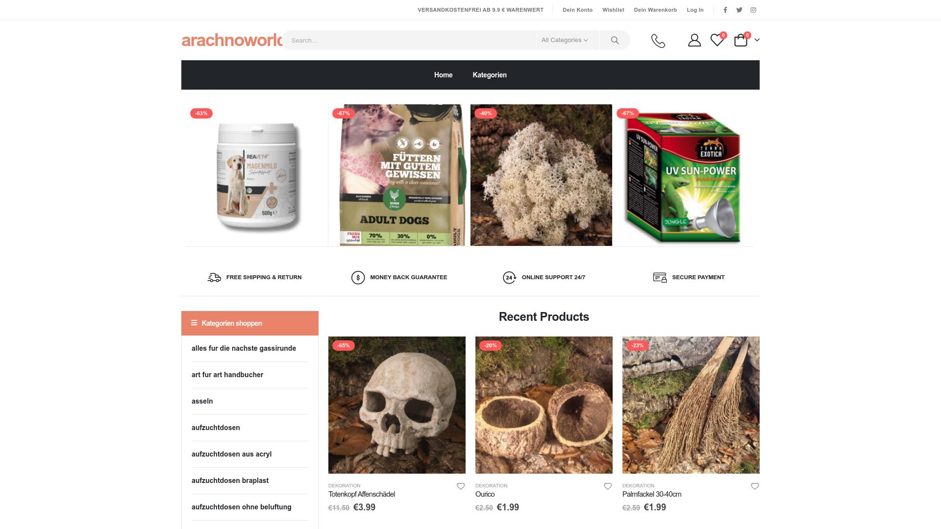 Die Webseite arachnoworld.de bietet eine Vielzahl von Produkten an, die hauptsächlich auf Tiere und deren Pflege ausgerichtet sind. Die Hauptkategorien der angebotenen Artikel umfassen Zubehör für Haustiere, insbesondere für Hunde, sowie verschiedene Dekorationsartikel. Im oberen Bereich der Seite sind unter anderem Artikel wie ein Magenmild-Pulver und ein Hundefutter für Erwachsene mit einem hohen Fleischanteil aufgelistet. Diese Produkte sind in speziellen Angeboten zu sehen, bei denen teils deutliche Preisreduzierungen angegeben sind. Zum Beispiel wird ein Hundefutter mit einem derartigen Rabatt von 67% präsentiert. Ein weiterer Produktschwerpunkt sind Artikel für die Terraristik, wie UV-Lampen, die für die optimale Beleuchtung von Reptilien und anderen Terrarientieren verwendet werden. Auch hier sind die Artikel in verschiedenen Preiskategorien und mit Discount-Angeboten erhältlich. Die Seite ist strukturiert, um eine einfache Navigation zu ermöglichen. Nutzer können durch verschiedene Kategorien blättern, die sich umfassend mit der Tierhaltung und -pflege befassen. Darunter fallen auch spezifische Kategorien wie „Aufzucht- und Dekorationsartikel“, die für bestimmte Tierarten oder für die Gestaltung von Terrarien nützlich sein können. Zusätzlich werden auf der Webseite Informationen zu Versandoptionen, Rückgabemöglichkeiten und Kundenservice bereitgestellt. Es wird unter anderem auf eine angebliche Geld-zurück-Garantie hingewiesen, was auf ein gewisses Maß an Kundenorientierung hinzudeuten scheint. Auch ein 24/7 Online-Support wird erwähnt, was den Nutzern jederzeit Hilfe und Unterstützung bei Fragen oder Unsicherheiten bieten soll. Die Produktpräsentation auf der Webseite ist visuell ansprechend gestaltet, mit Bildern, die die jeweiligen Artikel zeigen, und Preisangaben, die Rabatte hervorheben. Dies könnte darauf abzielen, das Einkaufserlebnis für die Nutzer zu verbessern und attraktive Kaufanreize zu schaffen. Insgesamt bietet die Webseite eine breite Auswahl an Produkten, die für Tierhalter und Terrarienliebhaber relevant sind, ohne dabei spezifische Marken oder Hersteller zu erwähnen.