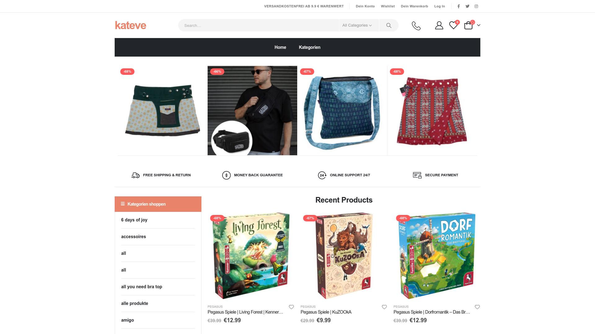 Die Webseite „kateve“ bietet eine Vielzahl von Produkten an, die in unterschiedlichen Kategorien eingeordnet sind. Auf der Homepage finden sich hauptsächlich Textilwaren, wie beispielsweise Taschen, Schürzen und Kleidungsstücke. Es sind Produkte mit einem deutlichen Rabatt von bis zu 68 % aufgeführt, was darauf hindeutet, dass die Seite möglicherweise Promotions oder Sonderangebote bewirbt. Darüber hinaus wird eine Kategorie mit dem Titel „6 days of joy“ angezeigt, in der anscheinend spezielle Produkte oder Aktionen untergebracht sind. Eine weitere Kategorie nennt sich „accessoires“, die zusätzliche Artikel umfasst. Die Darstellung der Produkte beinhaltet in der Regel Bilder, Preise und gegebenenfalls Rabatte. Die angezeigten Produkte scheinen ansprechend gestaltet zu sein, wobei die visuelle Präsentation darauf abzielt, eine breite Zielgruppe anzusprechen. Im Bereich der kürzlich hinzugefügten Produkte sind verschiedene Brettspiele abgebildet, darunter Titel wie „Living Forest“, „KuZOOKA“ und „Dorf Romantik“. Diese Spiele stammen anscheinend vom Anbieter Pegasus Spiele. Die Preisspannen dieser Spiele sind deutlich und werden als ermäßigt angezeigt. Die Webseite enthält weitere Informationen zu Versandleistungen, wie kostenlosen Versand ab einem bestimmten Warenwert und eine Geld-zurück-Garantie. Zudem wird darauf hingewiesen, dass ein Online-Support rund um die Uhr verfügbar ist. Die verfügbaren Zahlungsoptionen scheinen als „sicher“ beschrieben zu sein. Zusammenfassend lässt sich sagen, dass die Webseite eine Mischung aus Modeartikeln und Spielen anbietet, während sie durch spezielle Angebote und Dienstleistungen versucht, Kunden zu gewinnen.