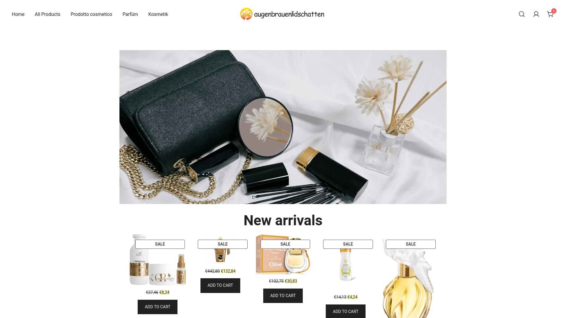 Die Webseite bietet eine Auswahl von kosmetischen Produkten, darunter Make-up, Parfüms und weitere Schönheitsartikel. Im oberen Bereich der Seite befinden sich Navigationslinks zu verschiedenen Kategorien wie „Home“, „All Products“, „Produito cosmetico“, „Parfüm“ und „Kosmetik“. Dies ermöglicht den Nutzern, durch das Sortiment zu navigieren und spezifische Produktkategorien auszuwählen. Auf der Hauptseite werden die neuesten Produkte in einer Sektion mit der Überschrift „New arrivals“ angepriesen. Hier finden sich verschiedene Artikel, die mit Preisen sowie einem „Add to Cart“-Button zur schnellen Kaufentscheidung versehen sind. Zu den dargestellten Produkten gehören unter anderem kosmetische Flüssigkeiten und Duftstoffe, wobei einige Artikel als im Angebot gekennzeichnet sind, was auf reduzierte Preise hinweist. Die Preisangaben sind in Euro und variieren je nach Artikel. Einige der gezeigten Produkte umfassen kosmetische Lotionen, Haarpflegeprodukte und verschiedene Parfümmarken. Es werden attraktive Rabatte angeboten, die die ursprünglichen Preise in einem durchgestrichenen Format daneben darstellen. Dies lässt auf mögliche Sonderaktionen oder Verkaufsveranstaltungen schließen, die für Käufer von Interesse sein könnten. Das Design der Webseite ist klar und visuell ansprechend, mit einer Darstellung von Produkten, die in einer ansprechenden Zusammenstellung präsentiert werden. Dies könnte potenzielle Nutzer anziehen, die nach neuen kosmetischen Produkten oder speziellen Angeboten suchen. Die Präsentation der Artikel erfolgt zusammen mit passenden Abbildungen, die die Produkte im Detail zeigen. Zusätzlich gibt es eine Suchfunktion und die Möglichkeit, den Warenkorb zu überprüfen, was eine einfache Handhabung der Seite ermöglichen soll. Die Benutzeroberfläche scheint darauf ausgelegt zu sein, den Einkaufsvorgang zu erleichtern und eine schnelle Navigation zu gewährleisten. Insgesamt ist die Webseite hinsichtlich ihrer Produktpalette auf Kosmetikartikel fokussiert und bietet eine strukturierte Möglichkeit, verschiedene Schönheitsprodukte zu entdecken und auszuwählen.