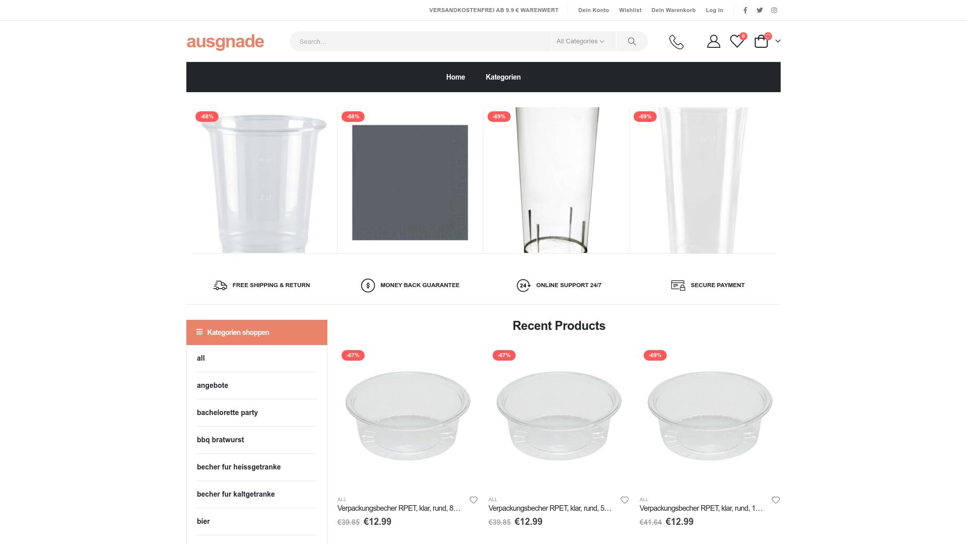 Die Webseite „ausgnade“ präsentiert eine Auswahl an verschiedenen Plastikbehältern und -verpackungen. Im oberen Bereich der Seite sind einige Produktbilder abgebildet, die hauptsächlich durchsichtige Becher und Schalen zeigen. Diese Produkte sind in verschiedenen Größen und Formen verfügbar, darunter beispielsweise Verpackungsbecher aus RPET (Recycling-Polyethylenterephthalat). Einige Produkte weisen erhebliche Preisnachlässe auf, die im Bereich von 67% bis 69% liegen. Die Nutzer können durch verschiedene Kategorien navigieren, die auf der linken Seite der Webseite aufgelistet sind. Zu den Kategorien gehören Angebote, Produkte für Bachelorette-Partys, BBQ-Wurst, Becher für heiße und kalte Getränke sowie eine spezielle Kategorie für Bier. Dies deutet darauf hin, dass die Webseite eine breite Auswahl an Produkten für verschiedene Veranstaltungstypen und Anlässe anbietet. Zusätzlich zur Produktauswahl bietet die Webseite an, dass der Versand ab einem bestimmten Bestellwert kostenfrei ist. Es wird ebenfalls auf eine Geld-zurück-Garantie hingewiesen, die dem Käufer eine Rücksendung der Ware ermöglicht, falls diese nicht den Erwartungen entspricht. Ein weiterer Service, der erwähnt wird, ist der 24/7 Online-Support, der Unterstützung in verschiedenen Anliegen bieten soll. Des Weiteren sind im oberen Bereich der Webseite Icons für den Warenkorb und das Benutzerkonto vorhanden, was die Interaktion für registrierte Nutzer erleichtert. Zudem können Nutzer Produkte auf eine Wunschliste setzen. Die Webseite stellt auch die Möglichkeit zur Verfügung, direkt nach Produkten zu suchen, was die Benutzererfahrung weiter verbessert. Insgesamt bietet die Webseite “ausgnade” eine Plattform für den Erwerb von überdurchschnittlich reduzierten Plastikverpackungen mit dem Ziel, eine breite Nutzergruppe anzusprechen, die an praktischen Lösungen für verschiedenste Anlässe interessiert ist.