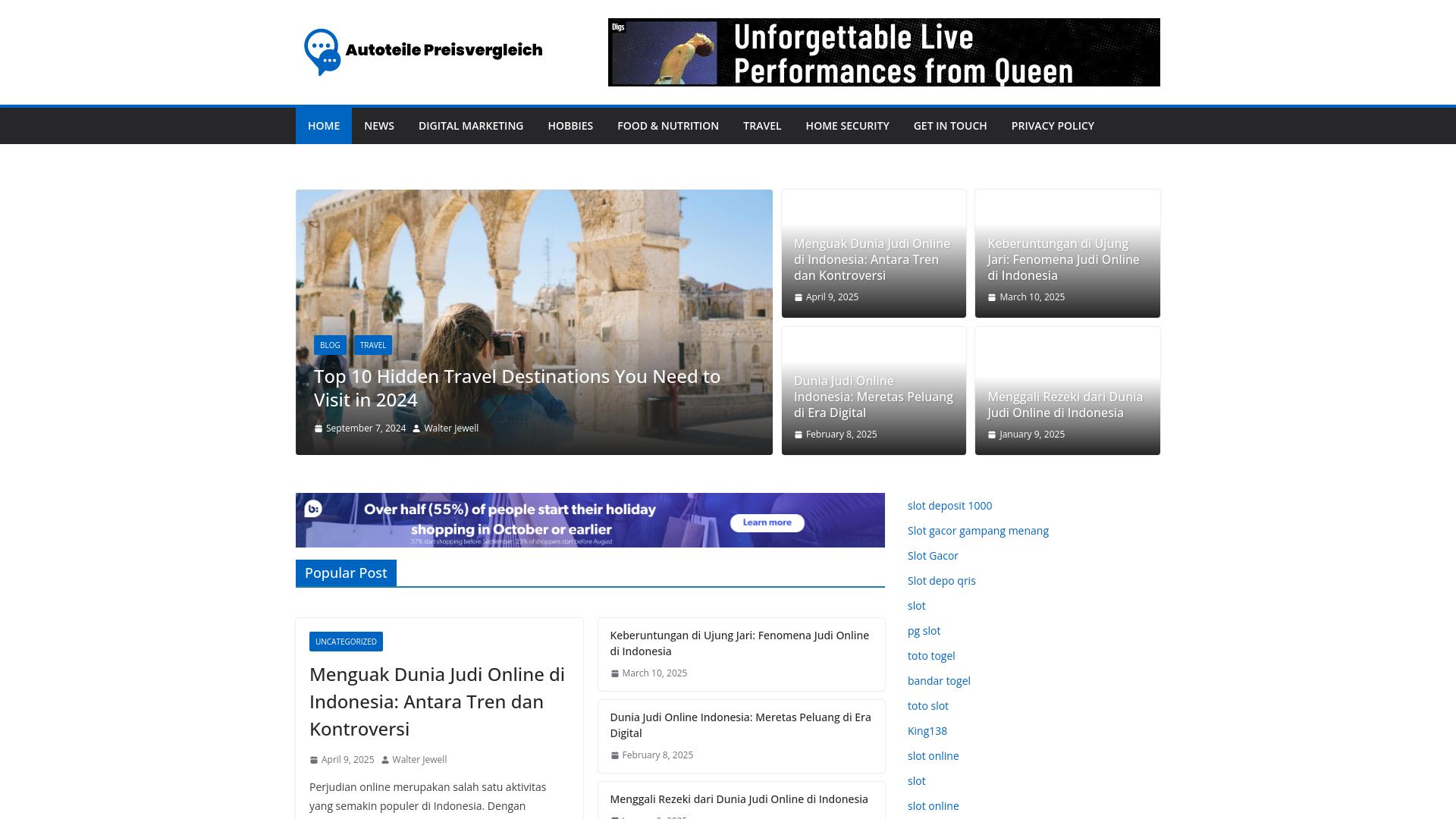 Die Webseite „Autoteile Preisvergleich“ bietet Inhalte, die sich auf verschiedene Themenbereiche konzentrieren. Auf der Startseite werden Kategorien wie „News“, „Digital Marketing“, „Hobbies“, „Food & Nutrition“, „Travel“, und „Home Security“ angezeigt. Diese Bereiche scheinen Einblicke und Informationen zu diesen Themen zu bieten, wobei der Fokus insbesondere auf den Aspekt des Preisvergleichs innerhalb der Fahrzeugteile liegt. Im Bereich „Blog“ werden Artikel zu einer Vielzahl von Themen veröffentlicht. Ein Beispielinhalt ist ein Artikel über die „Top 10 Hidden Travel Destinations You Need to Visit in 2024“, veröffentlicht am 7. September 2024. Weitere Beiträge befassen sich mit Themen, die sich auf das Glücksspiel im Internet beziehen, insbesondere im Kontext von Indonesien. Die Artikel tragen Titel wie „Menguak Dunia Judi Online di Indonesia: Antara Tren dan Kontroversi“ und „Dunia Judi Online Indonesia: Meretas Peluang di Era Digital“, die sich mit Trends und Entwicklungen im Online-Glücksspiel beschäftigen. Die Seite enthält außerdem Anzeigebanner, die möglicherweise auf verschiedene Produkte oder Dienstleistungen aufmerksam machen, darunter Angebote für Glücksspiel-Webseiten. Diese Banner sind oft mit auffälligen Texten versehen, die zur Interaktion mit den Nutzern anregen. Unter „Popular Post“ werden Artikel hervorgehoben, die möglicherweise häufig gelesen oder als besonders relevant erachtet werden. Viele dieser Artikel scheinen sich auf das Thema Online-Glücksspiel zu konzentrieren, was ein wiederkehrendes Element in der Präsentation der Inhalte ist. Die Navigationsstruktur der Webseite wirkt simpel, mit klaren Menüpunkten, die es Nutzern ermöglichen, die verschiedenen Themenbereiche zu durchsuchen. Die Navigation bietet zudem die Möglichkeit, den Kontakt zur Webseite aufzunehmen sowie auf die Datenschutzbestimmungen zuzugreifen. Insgesamt vermittelt die Seite den Eindruck, eine Plattform anzubieten, die sich mit verschiedenen Themen auseinandersetzt, wobei ein besonderer Schwerpunkt auf das Preisvergleich von Autoteilen und die Berichterstattung über Online-Glücksspiel gelegt wird.