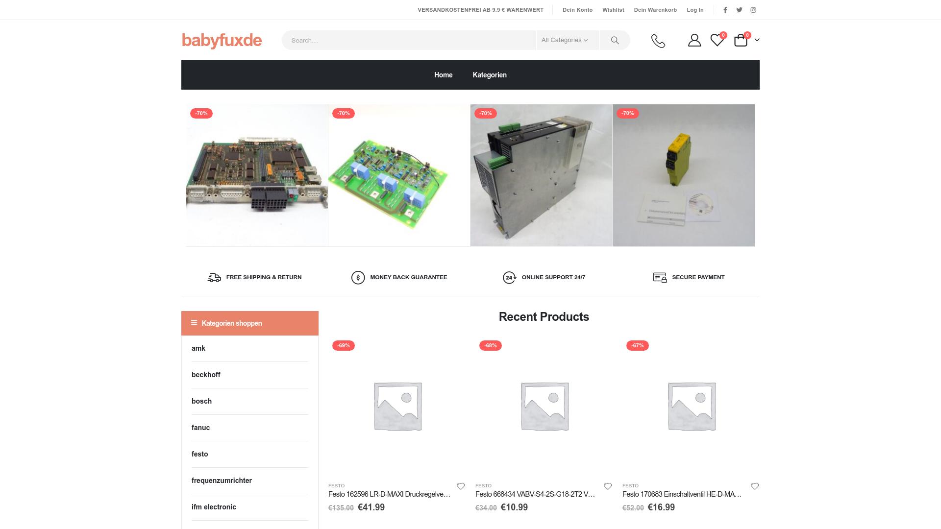 Die Webseite „babyfuxde“ präsentiert eine Auswahl an technischen Produkten und Geräten, die in mehreren Kategorien gruppiert sind. Im oberen Bereich der Seite sind verschiedene Artikel abgebildet, die anscheinend elektronische Komponenten und Baugruppen darstellen. Die Bilder zeigen unter anderem Leiterplatten und andere technische Geräte, die typischerweise in der Industrie eingesetzt werden. Die Webseite weist darauf hin, dass für die Produkte Rabatte von bis zu 70 % angeboten werden. Zu den angegebenen Garantien gehören eine Geld-zurück-Garantie und die Möglichkeit von kostenlosem Versand und Rückversand ab einem bestimmten Warenwert. Zudem wird darauf hingewiesen, dass rund um die Uhr ein Online-Support verfügbar ist, um Kundenanfragen zu beantworten. In einem seitlichen Menü können Benutzer durch die Produktkategorien navigieren. Die Kategorien beinhalten unter anderem bekannte Marken wie Beckhoff, Bosch und Fanuc, sowie spezifische Produkte von Herstellern wie Festo. Dies deutet auf ein Angebot hin, das sich an Fachleute oder Unternehmen richtet, die Ersatzteile oder industrielle Komponenten benötigen. An der unteren Seite der Startseite sind die neuesten Produkte aufgelistet, wobei für jedes Produkt der ursprüngliche Preis sowie der rabattierte Preis angegeben sind. Es wird darauf hingewiesen, dass bestimmte Artikel einen signifikanten Preisnachlass erfahren haben, was potenzielle Kaufinteresse wecken könnte. Die Webseite hat ein einfaches und klares Layout, das die Benutzererfahrung erleichtert. Es wird eine Sicherstellung der Zahlungsabwicklung angegeben, jedoch sind keine weiteren Informationen über die genauen Zahlungsmodalitäten oder die Sicherheitsstandards verfügbar. Insgesamt bietet die Seite eine Plattform für den Kauf von technischen Geräten und Ersatzteilen, wobei die Preisgestaltung und die angebotenen Dienstleistungen wie Versand und Support hervorgehoben werden.