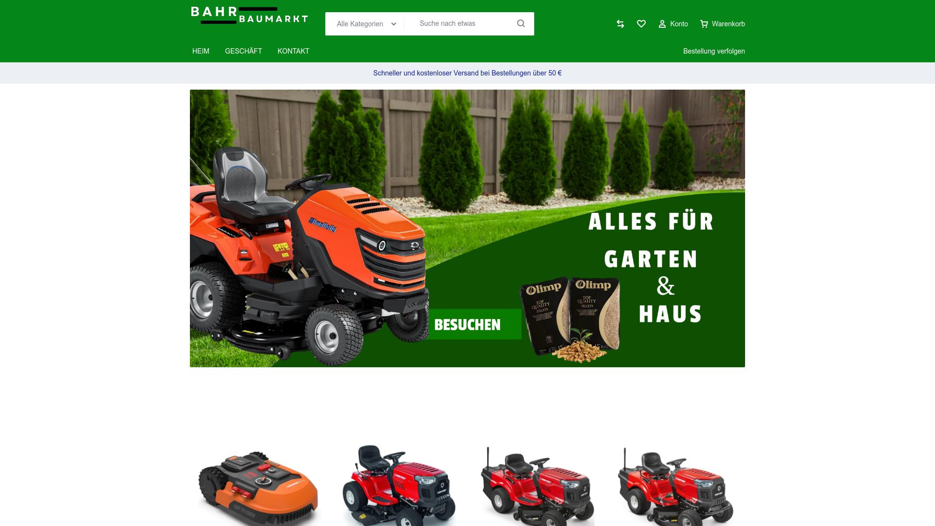 Die Webseite „Bahr Baumarkt“ präsentiert sich als Online-Plattform, die Produkte für Garten und Haus anbietet. Im oberen Bereich der Seite ist ein Bild eines Rasenmähers abgebildet. Es wird auf verschiedene Produkte hingewiesen, die für Gartenarbeiten nützlich sein könnten, darunter Rasentraktoren und andere Gartenmaschinen. Die Webseite bewirbt insbesondere eine Vielzahl von Gartengeräten, die für die Pflege von Rasenflächen und Gärten konzipiert sind. Hierzu zählen sowohl motorisierte Geräte wie Rasenmäher, als auch Zubehör, das für die Gartenarbeit benötigt wird. Des Weiteren gibt es Hinweise auf Artikel, die in den Kategorien „Garten“ und „Haus“ einsortiert sind. Die Struktur der Seite wirkt übersichtlich, mit einer Suchfunktion und Kategorien für eine gezielte Produktauswahl. Zusätzlich werden Informationen zu Versandoptionen bereitgestellt, darunter ein kostenloser Versand für Bestellungen über 50 Euro. Dies könnte potenziell für Kunden von Interesse sein, die größere Bestellungen aufgeben möchten. Im unteren Bereich der Webseite sind weitere Produkte abgebildet, darunter verschiedene Modelle von Rasentraktoren und automatisierten Rasenmähern. Die Darstellung der Produkte erfolgt meist mit Bildern und kurzen Beschreibungen, die auf die spezifischen Funktionen der Geräte eingehen. Zusammenfassend bietet die Webseite „Bahr Baumarkt“ eine Auswahl an Produkten für Garten und Haus, insbesondere im Bereich der Gartenpflege. Die Nutzer können durch die aufgeführten Kategorien und die Suchfunktion gezielt nach bestimmten Artikeln suchen. Ein Registrierungssystem für Kunden ist ebenfalls vorhanden, sowie Optionen zur Verwaltung ihres Kontos und Warenkorbs.