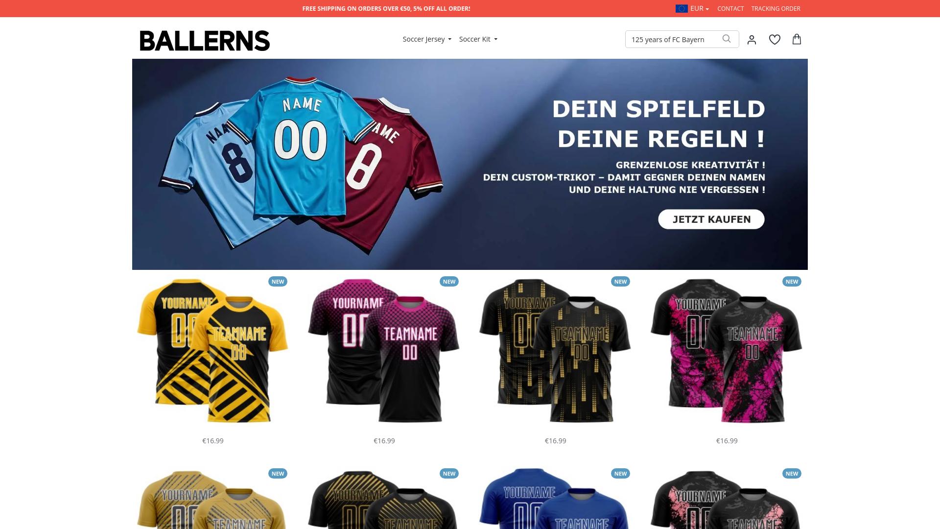 Die Webseite „BALLERNS“ bietet eine Auswahl an individuell gestaltbaren Fußballtrikots und -oberteilen an. Die Hauptmerkmale der Plattform umfassen die Möglichkeit, Trikots nach persönlichen Vorlieben zu gestalten. Auf der Seite sind verschiedene Designs und typografische Stile zu sehen, die es den Nutzern ermöglichen, ihren Namen und spezifische Teamnamen auf den Kleidungsstücken anzubringen. Die angebotenen Produkte sind in unterschiedlichen Farben und Designs verfügbar, wobei jede Option kreativ gestaltet ist. Die Nutzer können eine Vielzahl von Modellen auswählen, die nach ihren Wünschen angepasst werden können. Diese Anpassung umfasst die Wahl von Farben, Nummern und Schriftarten. Zudem finden sich auf der Seite Angebote für spezielle Anlässe oder Team-Events. Zusätzlich wird ein kostenloser Versand für Bestellungen über einem bestimmten Betrag beworben. Die Preisgestaltung für die Trikots beginnt bei etwa 16,99 Euro pro Stück. Die Plattform legt Wert auf kreative Freiheit und persönliche Gestaltungsmöglichkeiten für die Käufer, um den individuellen Stil der Nutzer zu unterstützen. Im oberen Bereich der Webseite wird ein werbender Slogan angezeigt, der auf die Kreativität der Gestaltungsmöglichkeiten hinweist. Die Nutzer werden ermutigt, ihre eigenen Designs zu erstellen und diese in einem ansprechenden Format anzuzeigen. Neben den Trikots könnten auch andere Arten von Sportbekleidung oder entsprechendes Zubehör angeboten werden, was jedoch nicht explizit aus dem Screenshot hervorgeht. Die Navigation auf der Seite erfolgt über ein Menü, das die Produktauswahl sowie Informationen zu Versand- und Kontaktoptionen umfasst. Für interessierte Käufer steht zudem eine Funktion bereit, um Bestellungen nachzuverfolgen. Die Präsentation der Produkte erfolgt in einem klaren und strukturierten Layout, das den Überblick über die verfügbaren Artikel erleichtert. Zusammenfassend enthält die Webseite „BALLERNS“ ein Angebot an individuell gestaltbaren Fußballtrikots, mit Fokus auf kreative Personalisierung und einer benutzerfreundlichen Online-Shopping-Erfahrung.
