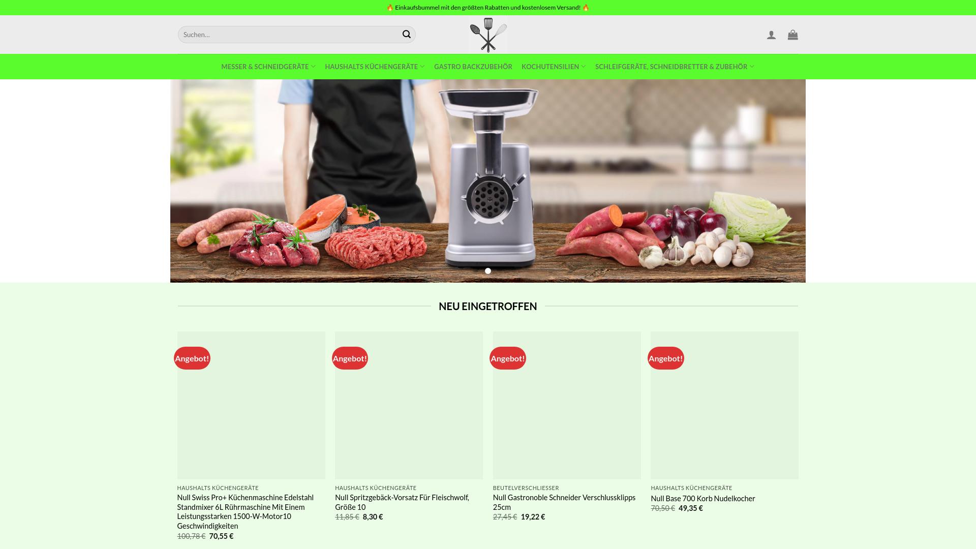 Die Webseite bietet eine Auswahl an Haushaltsküchengeräten und Zubehör an. Im Vordergrund steht eine elektrische Küchenmaschine, die als multifunktionales Gerät beschrieben wird und über einen 1500-Watt-Motor sowie 10 Geschwindigkeitsstufen verfügt. Ferner werden verschiedene Aufsätze vorgestellt, wie beispielsweise ein Spritzgebäck-Vorsatz für eine Fleischwolf-Maschine. Unter der Rubrik „Neu Eingetroffen“ werden aktuell verfügbare Produkte aufgelistet, darunter auch Küchenhelfer wie Schneider für Beutelverschlüsse sowie spezielle Küchengeräte wie ein Kochgerät für Nudeln. Preise der Produkte variieren, wobei einige als Angebote gekennzeichnet sind, was auf reduzierter Preisgestaltung hinweist. Die Kategorisierungen der Produkte sind in verschiedene Bereiche unterteilt, einschließlich Haushaltsküchengeräte, Gastro Backzubehör und weitere Schleifgeräte sowie Schneidbretter. Eine übersichtliche Navigation durch die Kategorien ermöglicht es den Nutzern, spezifische Produkte schnell zu finden. Ein dekoratives Bild, das verschiedene frische Zutaten wie Fleisch, Gemüse und Kräuter zeigt, ergänzt die Darstellung der angebotenen Produkte und vermittelt den Eindruck, dass die Geräte für die Zubereitung von Speisen gedacht sind. Die Farbgestaltung der Webseite ist hell und einladend, was das Stöbern angenehm gestaltet. Die Webseite enthält zudem Informationen zu Versandoptionen und möglichen Rabatten für Einkäufe, was typischerweise in Online-Shop-Kontexten zu finden ist. Nutzer könnten Interesse an den bereitgestellten Geräten haben, die für vielseitige Anwendungen in der Küche geeignet sind, sowohl für den häuslichen Gebrauch als auch für den professionellen Bereich. Insgesamt wird eine breite Palette an Produkten angeboten, die für die Küchenarbeit konzipiert sind, und die Gestaltung der Webseite legt Wert auf Benutzerfreundlichkeit und Übersichtlichkeit.