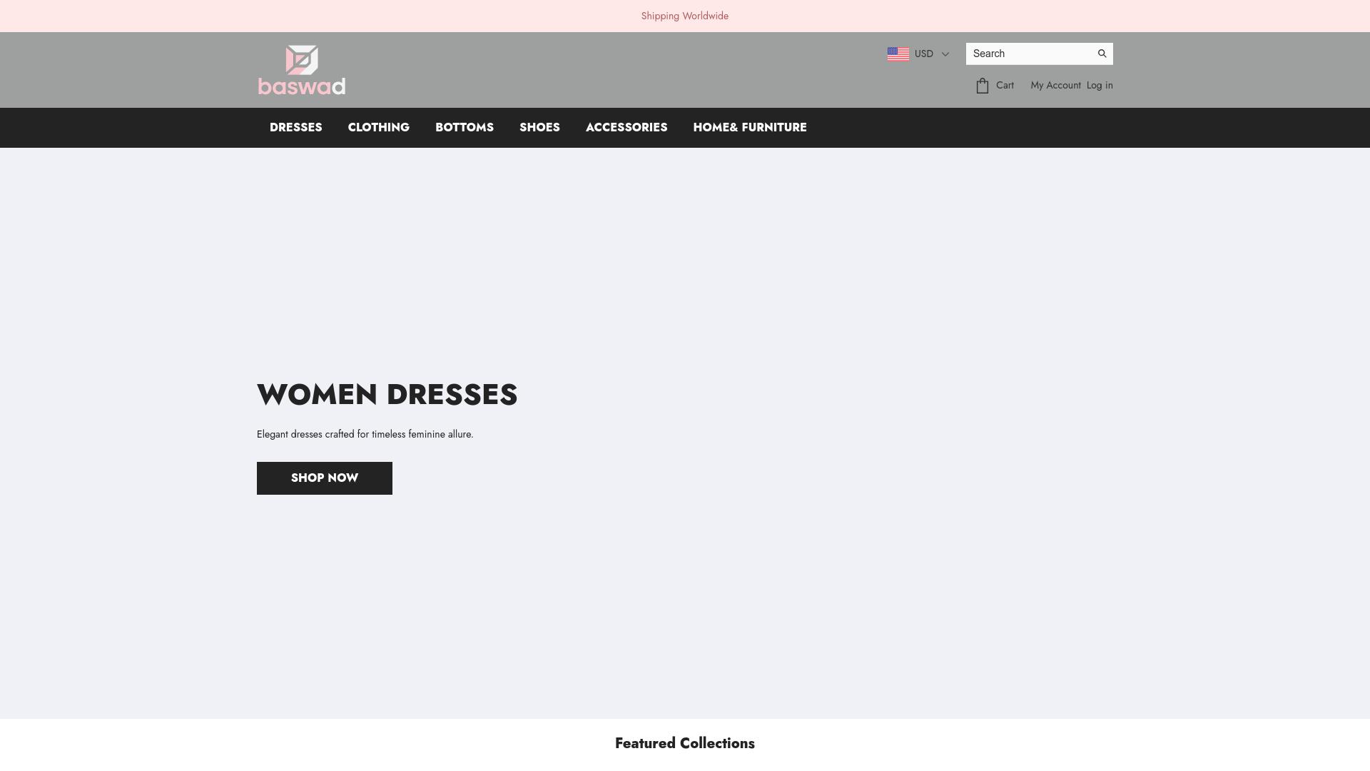 Auf der Webseite baswad wird eine Auswahl an Damenbekleidung angeboten, wobei der Schwerpunkt auf Kleidern liegt. Der Titel der Seite weist explizit auf die Kategorie „Women Dresses“ hin. Die Seite bietet Besucherinnen die Möglichkeit, durch ein Klicken auf einen Button mit der Aufschrift „SHOP NOW“ zu einer Einkaufsauswahl zu gelangen. Zusätzlich zu Kleidern wird auf der Webseite auch eine umfangreiche Produktkategorie mit verschiedenen Arten von Bekleidung in den Bereichen „Clothing“ und „Bottoms“ erwähnt. Dies deutet darauf hin, dass die Seite möglicherweise eine weitere Vielfalt an Damenmodeprodukten im Angebot hat. Die Verkaufsstrategie könnte darauf abzielen, eine Vielzahl von Bekleidungsstilen anzubieten, die auf unterschiedliche Geschmäcker und Anlässe ausgerichtet sein könnten. Des Weiteren sind auch Kategorien für „Shoes“, „Accessories“ und „Home & Furniture“ aufgeführt. Dies legt nahe, dass die Webseite ein Sortiment an modischen Schuhen und Accessoires für Frauen sowie Produkte für den Haushaltsbereich anbietet. Die Seitenstruktur weist auf eine Benutzernavigation hin, die den Zugriff auf die verschiedenen Produktkategorien erleichtert. Der Header der Seite hebt hervor, dass international versandt wird, was für potenzielle Käufer aus verschiedenen Ländern von Interesse sein könnte. Die Präsentation der Produkte erfolgt in einer klaren, übersichtlichen Gestaltung, die einem modernen E-Commerce-Standard entspricht. Alle Inhalte scheinen darauf ausgelegt zu sein, eine einfache und direkte Einkaufserfahrung zu ermöglichen, wobei die Nutzung von visuellen und textlichen Elementen zur Vermarktung der Produkte dient. Die Webseite vermittelt einen Eindruck von einem umfassenden Online-Shop, der sich auf die Bekleidungs- und Modebedürfnisse von Frauen konzentriert. Die präsentierten Designs und Produkte können in verschiedenen Stilen und möglicherweise Größen erhältlich sein,Details zu spezifischen Produkten oder Preisen sind jedoch nicht aus dem vorliegenden Screenshot ersichtlich.