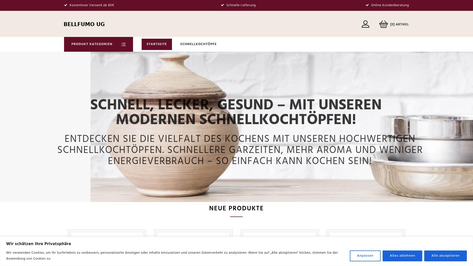 Die Webseite „Bellfumo UG“ bietet eine Auswahl an Schnellkochtöpfen an. Das Hauptaugenmerk der Seite liegt auf der Präsentation dieser Küchengeräte, die in verschiedenen Varianten erhältlich sind. Auf der Startseite wird darauf hingewiesen, dass die Schnellkochtöpfe Vorteile wie schnellere Garzeiten, intensiveren Geschmack und einen geringeren Energieverbrauch bieten sollen. Die Webseite lädt Besucher ein, die Vielfalt der verfügbaren Produkte zu entdecken. Es werden Eigenschaften hervorgehoben, die das Kochen effizienter gestalten könnten. Zusätzlich zu den Produktbeschreibungen beinhaltet die Seite eine Sektion für neue Produkte, was darauf hindeutet, dass regelmäßig neue Artikel angeboten werden. Die Nutzer haben die Möglichkeit, durch verschiedene Produktkategorien zu navigieren, um spezifische Informationen zu den Angeboten zu erhalten. Ein weiteres Merkmal der Webseite ist die Erwähnung von kostenlosem Versand ab einem Bestellwert von 80 Euro. Der Prozess für die Online-Kundenberatung wird ebenfalls angesprochen, was auf die Möglichkeit hinweist, Fragen zu den Produkten direkt über die Webseite zu klären. Außerdem wird eine schnelle Lieferung der Produkte in Aussicht gestellt. Die Webseite weist auf die Verwendung von Cookies hin, um die Benutzererfahrung zu verbessern. Nutzer werden aufgefordert, der Verwendung von Cookies zuzustimmen, was gängige Praxis auf vielen modernen Webseiten darstellt. Die Informationen und Angebote sind klar strukturiert, und die Webseite scheint benutzerfreundlich gestaltet zu sein, um den Besuchern das Finden der gewünschten Produkte zu erleichtern. Es wird ein unkomplizierter Zugang zu den Angeboten und möglicherweise eine Auswahl an Zahlungsmethoden bereitgestellt. Insgesamt bietet die Webseite „Bellfumo UG“ eine Plattform für den Kauf von Schnellkochtöpfen mit Informationen zu Produkten, Versandoptionen und Kundenservice.