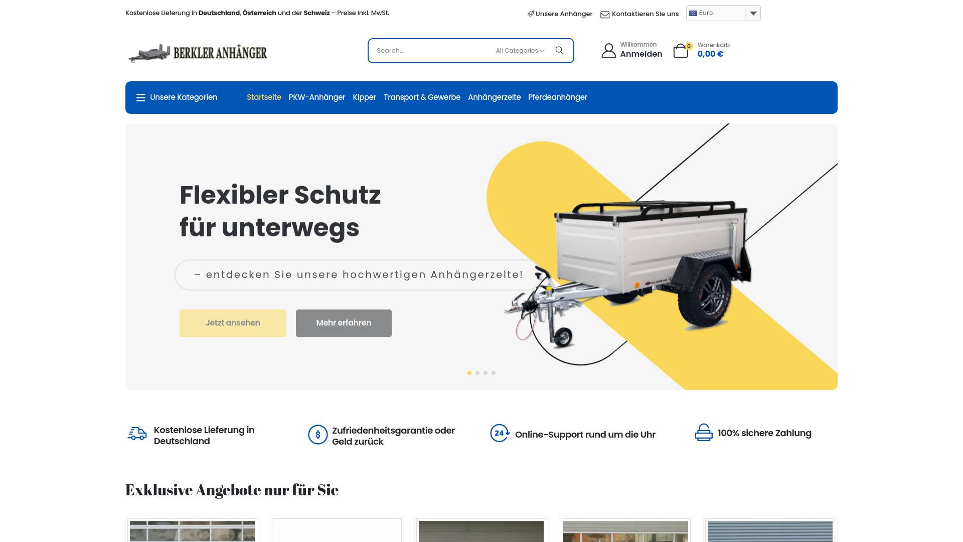 Die Webseite Berkler Anhänger bietet eine Auswahl an Produkten, die sich hauptsächlich auf Anhänger und Zubehör konzentriert. Die Nutzer finden hier verschiedene Kategorien von Anhängern, einschließlich PKW-Anhängern, Kippern, Transport- und Gewerbeanhängern sowie Anhängerzelten und Pferdeanhängern. Die Seite ist darauf ausgerichtet, umfassende Informationen zu den einzelnen Kategorien zu bieten, um den Kunden bei der Auswahl des passenden Produkts zu helfen. Ein wichtiges Merkmal der Webseite ist die Betonung eines flexiblen Schutzes für Anhänger, wobei spezifisch auf die hochwertigen Anhängerzelte verwiesen wird. Zudem wird unter einem hervorgehobenen Bereich das Konzept des „flexiblen Schutzes für unterwegs“ vorgestellt, welches potenziell Anreiz für Nutzer bieten könnte, sich näher mit den angebotenen Produkten zu befassen. Die Seite weist darauf hin, dass eine kostenlose Lieferung innerhalb Deutschlands, Österreichs und der Schweiz verfügbar ist. Gleichzeitig werden einige Dienstleistungen hervorgehoben, wie eine Zufriedenheitsgarantie oder die Möglichkeit, Geld zurückzuerhalten, sowie ein 24-Stunden-Online-Support. Im unteren Bereich der Webseite werden exklusive Angebote präsentiert, die anscheinend speziell für die Nutzer bereitgestellt werden. Diese Angebote könnten Produkte zu ermäßigten Preisen oder besondere Bundles umfassen. Die Seite ist einfach und klar strukturiert, mit einem ansprechenden Layout, das eine unkomplizierte Navigation durch die verschiedenen Kategorien ermöglicht. Die Benutzer können darüber hinaus ihren Warenkorb verfolgen und auf einfache Art und Weise eine Bestellung aufgeben. Es finden sich zudem Informationen zu Zahlungsmethoden, wobei auf die Sicherheit der Zahlungen verwiesen wird. Insgesamt bietet die Webseite eine breite Palette von Anhängern und Zubehörteilen, unterlegt mit zusätzlichen Dienstleistungen und Angeboten, die darauf abzielen, den Nutzern eine zufriedenstellende Einkaufserfahrung zu gewährleisten.