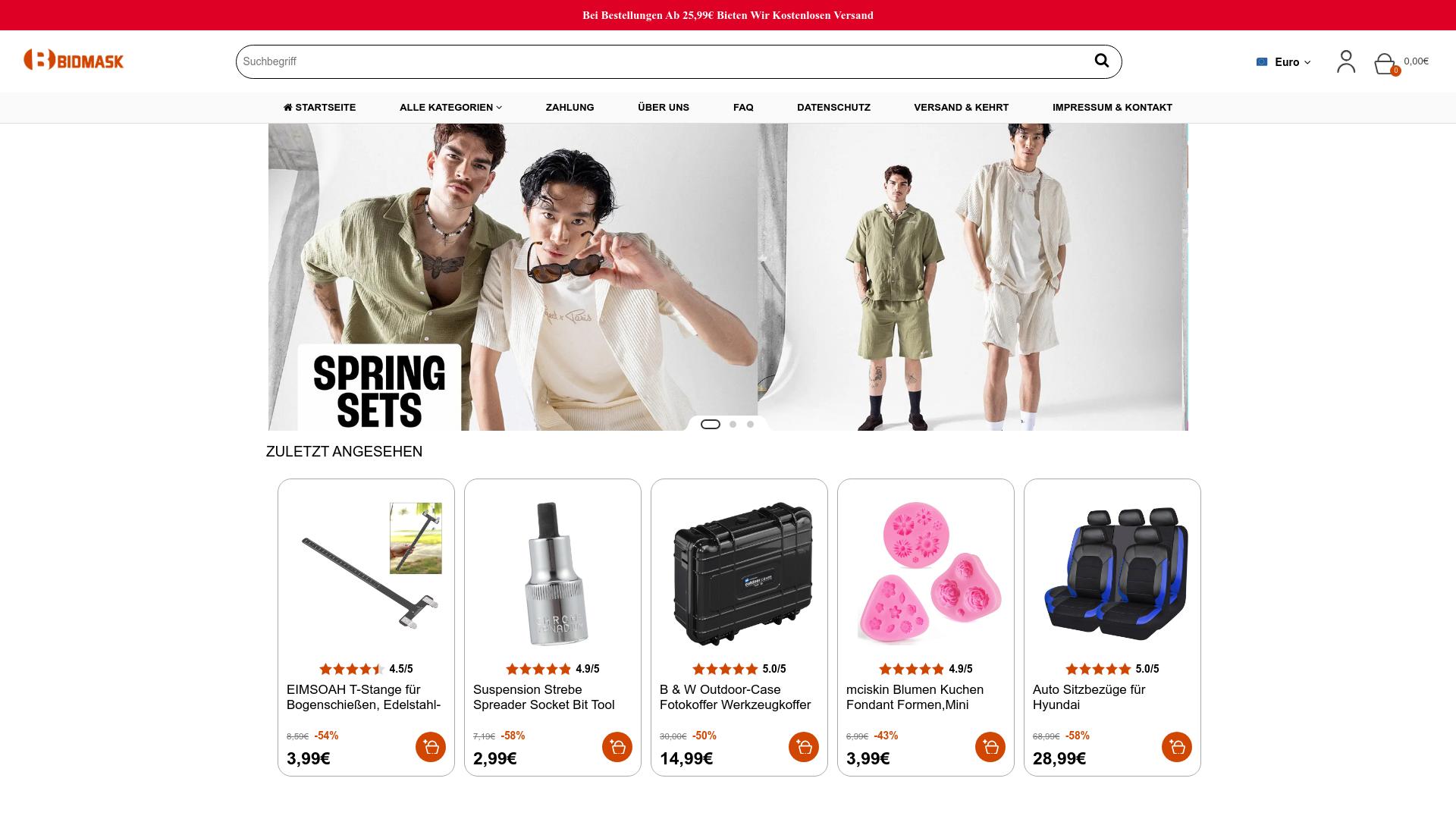 Die Webseite bietet eine Vielzahl von Produkten in verschiedenen Kategorien an. Auf der ersten Seite wird ein Fokus auf Mode und Accessoires gelegt, wobei spezielle Angebote für die Frühjahrs-Saison hervorgehoben werden. Es werden sowohl Kleidung als auch praktische Artikel präsentiert. Zu den angebotenen Produkten gehören unter anderem eine T-Stange für das Bogenschießen aus Edelstahl, die als besonders stabil beschrieben wird, sowie ein Fotokoffer aus strapazierfähigem Material, der für den sicheren Transport von Werkzeugen gedacht ist. Weitere Artikel umfassen Backutensilien, darunter Silikonformen für das Herstellen von Kuchendekorationen, sowie Auto-Sitzbezüge, die speziell für Modelle von Hyundai angeboten werden. Das Design der Webseite ist übersichtlich und bietet eine Präsentation der Artikel mit Bildern, Preisen und Bewertungen, die auf einer Skala von 1 bis 5 Sternen angezeigt werden. Die Bewertungen der Produkte scheinen überwiegend positiv zu sein, jedoch werden diese in der Beschreibung nicht weiter kommentiert. Die Webseite bietet zudem Informationen zu Zahlungsmethoden, Versand und Rückgabebedingungen in separaten Bereichen. Es wird ein kostenloser Versand ab einem Bestellwert von 25,99 Euro angeboten. Der Versand- und Retourenbereich enthält die notwendigen Informationen für Kunden, die eine Bestellung aufgeben möchten oder Fragen zu existierenden Bestellungen haben. In der Kopfzeile der Webseite finden sich auch Links zu einem FAQ-Bereich und zur Datenschutzrichtlinie, die den Nutzern detaillierte Antworten auf häufig gestellte Fragen bieten sollen. Ein Impressum und Kontaktinformationen sind ebenfalls vorhanden, um den Nutzern die Möglichkeit zu geben, bei weiteren Anliegen direkt mit dem Anbieter in Verbindung zu treten. Insgesamt liegt der Schwerpunkt der Webseite auf der Präsentation einer breiten Palette an Produkten mit einem klaren Fokus auf Preisreduzierungen und Angeboten, die ausschließlich visuell und technisch beschrieben werden, ohne detaillierte Erläuterungen zu den speziellen Eigenschaften oder Vorteilen der Produkte zu geben.