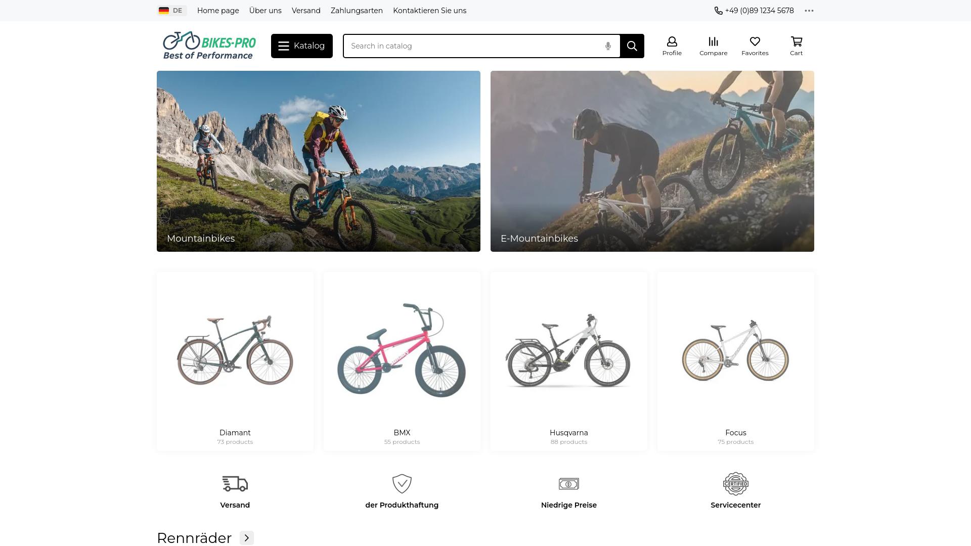 Die Webseite „Bikes-Pro“ bietet eine Vielzahl von Fahrrädern und Zubehör an. Im Hauptbereich der Seite sind verschiedene Kategorien zu finden, darunter Mountainbikes, E-Mountainbikes, Rennräder und BMX-Räder. Jede Kategorie ist mit Bildern und der Anzahl der verfügbaren Produkte versehen. Beispielsweise ist die Kategorie „Diamant“ aufgeführt, die 73 Produkte umfasst, während die BMX-Kategorie 55 Produkte umfasst. Unter den Bereichen für Produkte sind zentrale Informationen wie Versandoptionen und Preisgestaltung dargestellt. Es wird auf eine Produkthaftung hingewiesen sowie auf niedrigere Preise, die möglicherweise in Verbindung mit den angebotenen Waren stehen. Zusätzlich gibt es einen Abschnitt über ein Servicecenter, das anscheinend Unterstützung für Kunden anbietet. In der Kopfzeile der Webseite sind mehrere Navigationsmöglichkeiten zu finden, darunter Links zu einem Katalog, einer Suchleiste sowie Kontaktinformationen. Die Seite legt Wert auf Benutzerfreundlichkeit durch eine klare Struktur, die es den Nutzern ermöglicht, schnell zwischen den verschiedenen Produktkategorien zu wechseln. Im Footer der Seite sind Kontaktdaten angegeben, einschließlich einer Telefonnummer, die für Kundenanfragen genutzt werden kann. Die Webseite hat die Spracheinstellung auf Deutsch, was darauf hinweist, dass sie sich an deutschsprachige Nutzer richtet. Zusammenfassend lässt sich sagen, dass die Webseite eine Vielzahl von Fahrrädern und Zubehör exklusiv für verschiedene Fahrradtypen anbietet, mit einem Fokus auf eine klare Präsentation der Produkte und einer einfachen Navigation für die Nutzer.