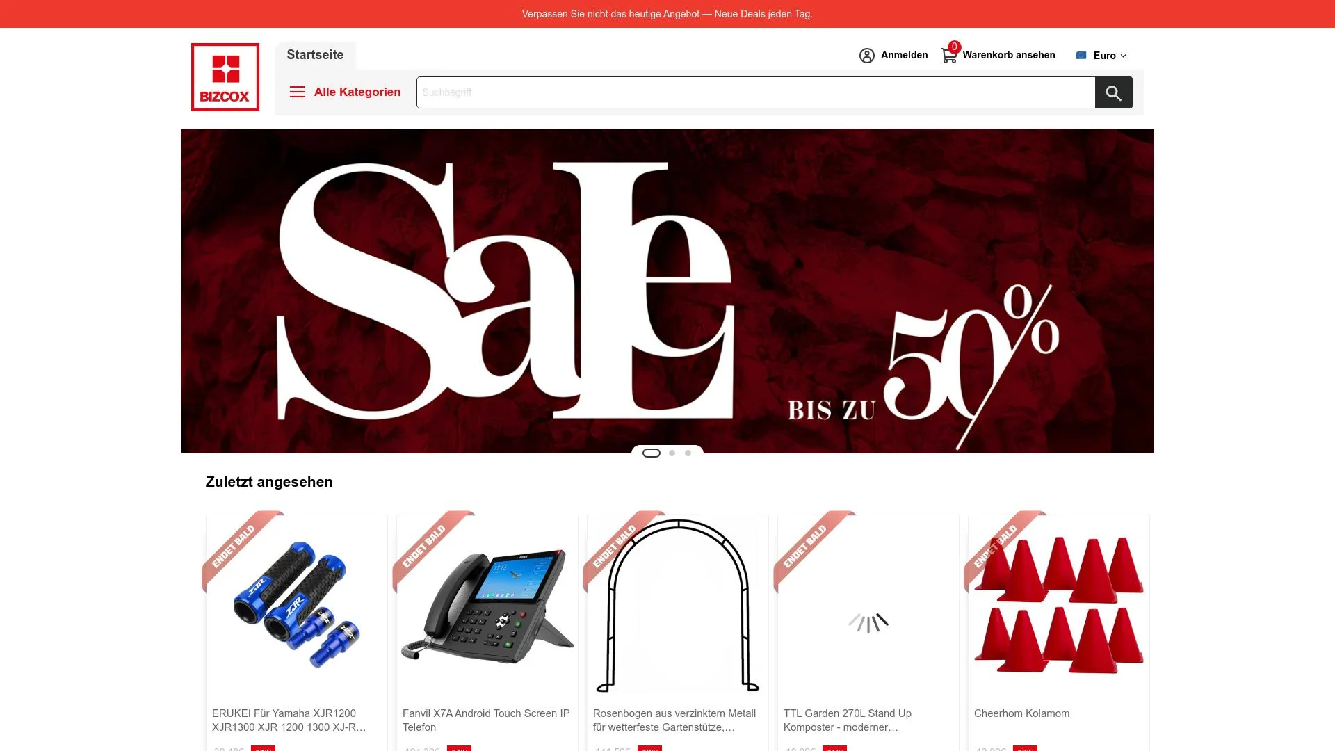 Die Webseite bietet eine Vielzahl von Produkten in verschiedenen Kategorien an. Auf der Hauptseite wird ein großer Banner angezeigt, der auf einen Verkaufsbereich hinweist, in dem bis zu 50% Rabatt auf ausgewählte Artikel angeboten werden. Die Benutzeroberfläche der Seite enthält eine Suchleiste, mit der Nutzer gezielt nach bestimmten Produkten suchen können. Unter dem Banner sind einige Produkte aufgelistet, die zuletzt von Nutzern angesehen wurden. Dazu gehören unter anderem: 1. **ERUKEI Für Yamaha XJR1200**: Diese Produktkategorie umfasst Zubehörteile, die speziell für die Motorräder Yamaha XJR1200 und XJR1300 entwickelt wurden. 2. **Fanvil X7A Android Touch Screen IP Telefon**: Dieses Gerät ist ein IP-Telefon mit einem Touchscreen, das für gewerbliche Anwendungen konzipiert ist. 3. **Rosenbogen aus verzinktem Metall**: Dieses Produkt ist ein Gartenbogen aus verzinktem Metall, das für die Verwendung im Freien geeignet ist und wetterfest sein soll. 4. **TTL Garden 270L Stand Up Komposter**: Dieses Produkt ist ein Komposter, der für eine effektive Abfallverwertung im Garten gedacht ist. 5. **Cheerhom Kolamom**: Diese Artikel erscheinen in der Form von farbigen Kegelaufsätzen, die möglicherweise eine Anwendung im Bereich der Gartenarbeit oder Dekoration finden. Die Seite stellt eine übersichtliche Anordnung der Produkte zur Verfügung und lässt Raum für weitere Kategorien, die durch das Hauptmenü aufgerufen werden können. Es wird auch auf einen Warenkorb verwiesen, wo Nutzer ihre ausgewählten Artikel einsehen können. Die Benutzer müssen sich anmelden, um die vollständige Funktionalität der Seite zu nutzen. Insgesamt steht die Seite im Zeichen von Sonderangeboten und Rabattaktionen, wobei eine breite Palette von Produkten in den Bereichen Freizeit, Garten und Technologie angeboten wird.