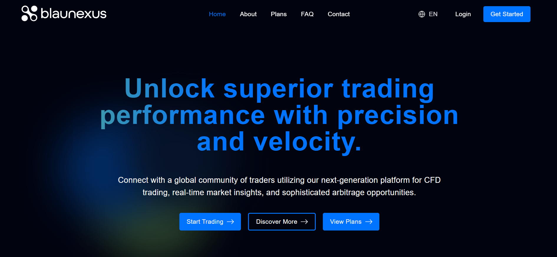 Die Webseite „blaunexus“ bietet einen Online-Handelsdienst an, der sich auf den Handel mit Contracts for Difference (CFD) spezialisiert. Auf der Startseite wird den Nutzern nahegelegt, sich mit einer globalen Gemeinschaft von Händlern zu vernetzen und die vorgestellte Plattform zu nutzen, um Handelsmöglichkeiten effektiv zu nutzen. Die Plattform betont ihre nächste Generation an Technologien, um den Nutzern zu ermöglichen, präzise und schnelle Handelsentscheidungen zu treffen. Es wird darauf hingewiesen, dass die Nutzer Zugang zu Echtzeit-Markteinblicken haben, die für fundierte Entscheidungen im Handelsprozess hilfreich sein könnten. Zudem wird die Möglichkeit erwähnt, von komplexen Arbitragemöglichkeiten zu profitieren, die die Differenz zwischen Preisunterschieden auf verschiedenen Märkten ausnutzen. Für Interessierte werden verschiedene Pläne angeboten, die vermutlich unterschiedliche Leistungsstufen und Features darstellen. Es gibt auch Unterstützung durch einen FAQ-Bereich sowie die Möglichkeit, direkt Kontakt aufzunehmen. Am oberen Rand der Seite sind Navigationslinks zu finden, die dem Nutzer einen schnellen Zugang zu den Informationen über die Plattform, ihre Angebote und den Kundenservice ermöglichen. Die Seite enthält auch Handlungsaufforderungen wie „Start Trading“ und „Discover More“, die den Nutzer animieren, sich intensiver mit den Dienstleistungen auseinanderzusetzen oder ein Konto zu eröffnen. Sie ist in einem modernen Layout gestaltet und nutzt eine dunkle Farbgebung mit Kontrasten in Blau und Weiß, um die Benutzererfahrung zu verbessern. Insgesamt richtet sich die Webseite „blaunexus“ an Personen, die sich für den Online-Handel interessieren und Zugang zu umfangreichen Handelsressourcen sowie Gemeinschaftsunterstützung suchen. Sie präsentiert sich als Plattform, die speziell für den CFD-Handel konzipiert wurde und zahlreiche Funktionen zur Unterstützung der Handelsentscheidungen hervorhebt.