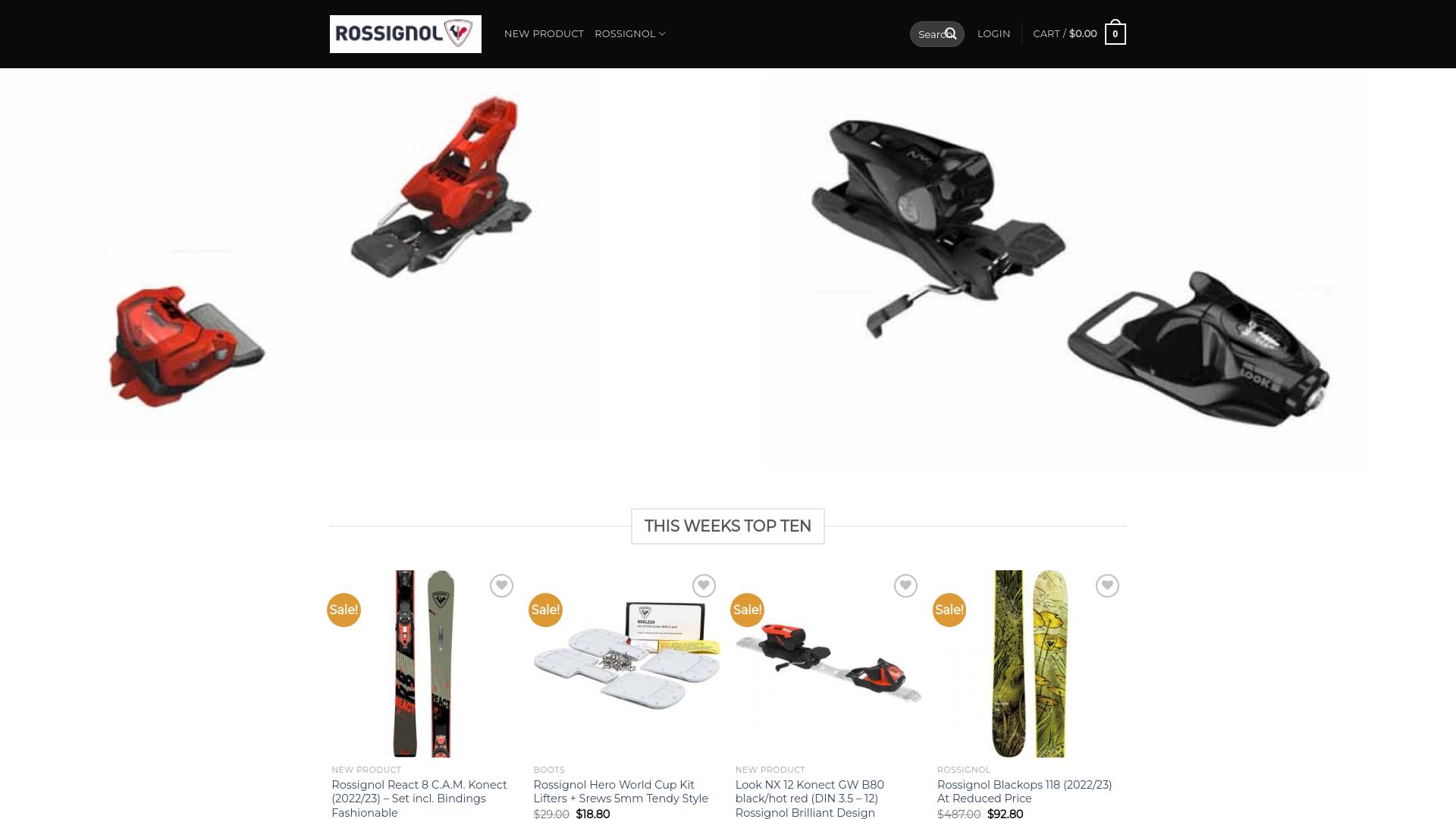 Die in der Abbildung dargestellte Webseite ist ein Online-Shop, der sich auf den Verkauf von Skiausrüstung und -zubehör spezialisiert hat. Im Fokus stehen verschiedene Produkte der Marke Rossignol, darunter Skibindungen und Skier. Die obere Hälfte der Webseite zeigt mehrere Skibindungen in unterschiedlichen Farben und Designs. Auf der rechten Seite sind spezifische Produktdetails und Bilder zu finden, die die verschiedenen Bindungen abbilden. Diese Produkte scheinen unterschiedliche Modelle zu repräsentieren, die für verschiedene Skifahrstile geeignet sind, wobei einige Bindungen in auffälligen Farben präsentiert werden. Im unteren Bereich der Webseite wird ein Sortiment an weiteren Artikeln angeboten, darunter auch Skier, die ebenfalls mit Abbildungen und kurzen Beschreibungen versehen sind. Beispielhafte Artikel umfassen das Modell „Rossignol React 8 C.A.M. Konect“ sowie die „Rossignol Blackops 118“ Skier, die beide als „New Product“ und mit Preisreduktionen gekennzeichnet sind. Neben diesen Angeboten werden auch Boots und Zubehör, wie das „Rossignol Hero World Cup Kit“, gelistet. Zusätzlich sind die Produkte mit auffälligen „Sale!“-Kennzeichnungen versehen, was auf temporäre Preisangebote hinweisen könnte. Diese Kennzeichnungen sollen den Nutzern eine schnelle Übersicht über reduziertes Angebot verschaffen. Auf der Webseite finden sich auch Navigationselemente, die es den Nutzern ermöglichen, sich in den Kategorien umzusehen und gezielt nach bestimmten Produkten zu suchen. Dabei wird eine Suchleiste und ein Einkaufswagen-Symbol angezeigt, was darauf hinweist, dass Nutzer Artikel in ihren Warenkorb legen können. Insgesamt bietet die Webseite eine Auswahl an Skiausrüstung, insbesondere von der Marke Rossignol, mit einer klaren Struktur, die den Nutzern eine einfache Navigation durch verschiedene Kategorien und Produkte ermöglicht.