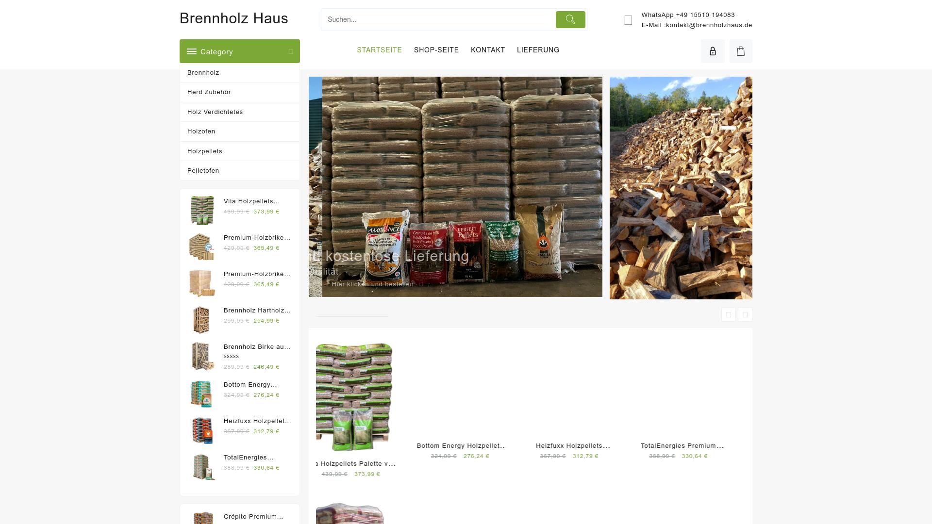 Die Webseite „Brennholz Haus“ bietet eine Auswahl an Produkten im Bereich Brennholz und Zubehör an. Nutzer finden in verschiedenen Kategorien Produkte, die für ökologisches Heizen und den Einsatz in Holzöfen geeignet sind. Die Hauptkategorie „Brennholz“ listet unterschiedliche Arten von Brennholz, darunter Hartholz und andere Holzsorten, die in verschiedenen Verpackungsgrößen erhältlich sind. Zusätzlich umfasst das Angebot Holzpellets, die in verschiedenen Marken und Qualitäten bereitgestellt werden. Die Preise für die aufgelisteten Produkte variieren, und einige Artikel sind als rabattierte Angebote gekennzeichnet. Zum Beispiel werden Premium-Holzbriketts und bestimmte Holzpellet-Varianten mit Preisen angegeben, die möglicherweise von der Stückmenge abhängen. Im oberen Bereich der Webseite werden Bilder von Holzprodukten und Lagerbeständen angezeigt, was auf eine visuelle Präsentation der angebotenen Waren abzielt. Es gibt auch einen Bereich, der auf kostenlose Lieferoptionen hinweist, was für Interessierte an der Lieferung von Brennholz oder Brennstoffen von Bedeutung sein könnte. Des Weiteren bietet die Webseite Kontaktinformationen an, darunter eine WhatsApp-Nummer und eine E-Mail-Adresse für Anfragen. Eine Suchfunktion ist ebenfalls vorhanden, die es Nutzern ermöglicht, gezielt nach bestimmten Produkten zu suchen. Weitere Kategorien umfassen Zubehör für Herde, Holzöfen und Pelletöfen, was darauf hinweist, dass die Seite ein umfassendes Sortiment für Nutzer, die auf Holzheizungen angewiesen sind, bereitstellt. Die Nutzer können die Seite nutzen, um sich über verschiedene Produkte zu informieren und diese online zu bestellen. Die Gesamtheit der dargestellten Angebote legt den Fokus auf nachhaltige Heizlösungen und verwandte Produkte, die sich an umweltbewusste Verbraucher richten. Die Informationen und Strukturen der Webseite sind darauf ausgerichtet, eine einfache Navigation und ein klares Einkaufserlebnis zu ermöglichen.