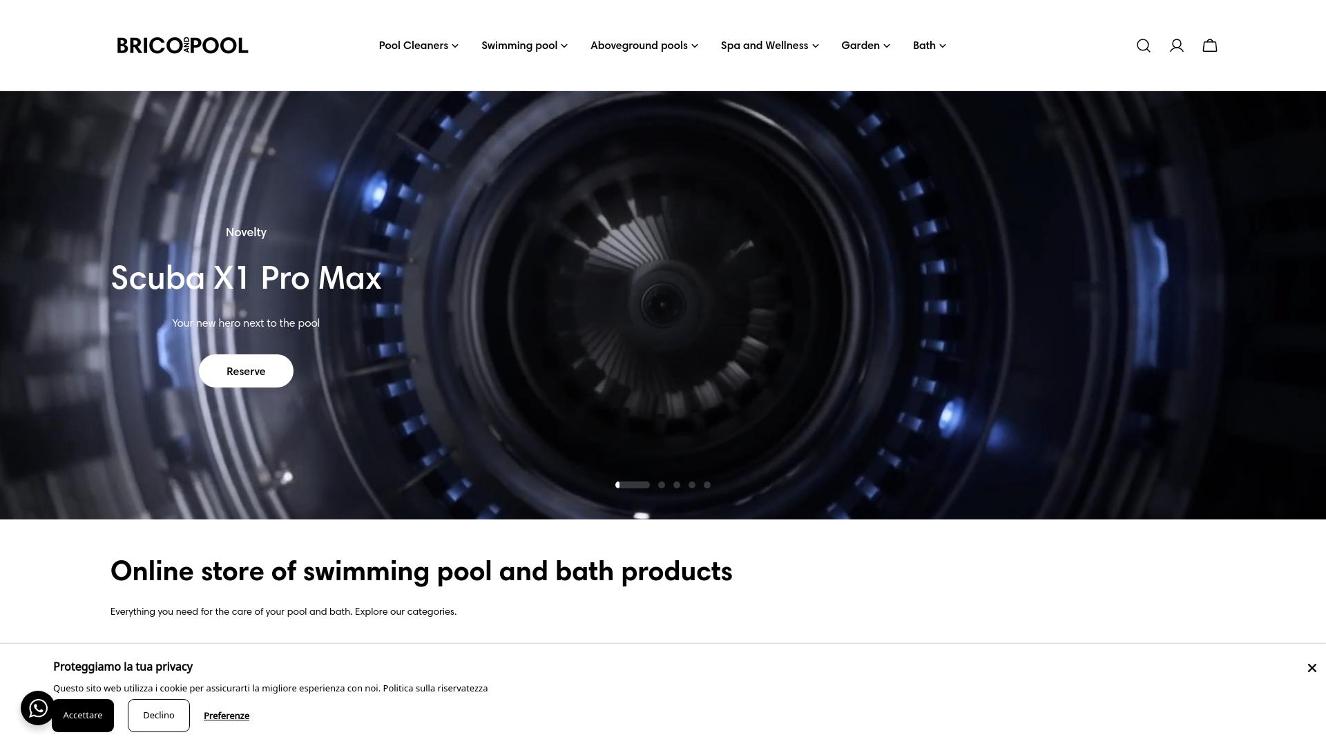 Die Webseite „bricopool.com“ präsentiert sich als Online-Shop, der Produkte für Schwimmbecken und Badezimmer anbietet. Im Fokus stehen verschiedene Kategorien von Artikeln, die zur Pflege und Wartung von Pools sowie zur Ausstattung von Badezimmern verwendet werden können. Auf der Startseite wird ein speziell betontes Produkt, das „Scuba X1 Pro Max“, vorgestellt. Es wird als Neuheit bezeichnet und scheint für die Reinigung von Schwimmbecken konzipiert zu sein. Nutzer haben die Möglichkeit, in verschiedenen Kategorien von Produkten zu stöbern, die für die Instandhaltung und das Zubehör von Pools relevant sind. Zu den thematischen Schwerpunkten gehören Poolreiniger, überirdische Pools, und Produkte für Wellness und Garten. Die Webseite enthält auch Angebote für verschiedene Poolreinigungslösungen, die möglicherweise unterschiedliche Funktionen oder Designs aufweisen. Diese Produkte klingen daraufhin ausgerichtet, verschiedene Bedürfnisse im Hinblick auf die Poolpflege zu adressieren. Zusätzlich wird auf der Seite die Erwartung vermittelt, dass Nutzer in der Lage sind, alle notwendigen Artikel zur Pflege ihrer Pools und Badezimmer zu finden, angeführt durch eine Kategorieaufteilung, die ein einfaches Navigieren ermöglicht. Die Filtration der Produkte könnte potenziell auf die spezifischen Anforderungen und Vorlieben der Nutzer zugeschnitten sein. Der Bereich „Spa and Wellness“ deutet darauf hin, dass auch Produkte für den entspannenden Bereich des Badezimmers oder Pools im Sortiment erhältlich sind, was auf eine Erweiterung der Produktpalette hinweist. Insgesamt bietet die Webseite eine Übersicht über verschiedene Kategorien im Bereich Pool- und Badezubehör, mit dem Ziel, eine benutzerfreundliche Einkaufserfahrung zu gewährleisten. Hinweise auf die Preisgestaltung oder spezifische Funktionen der Produkte sind auf dem Screenshot nicht ersichtlich, jedoch wird ein Zugang oder eine Möglichkeit zur Reservierung des vorgestellten Produkts bereitgestellt.