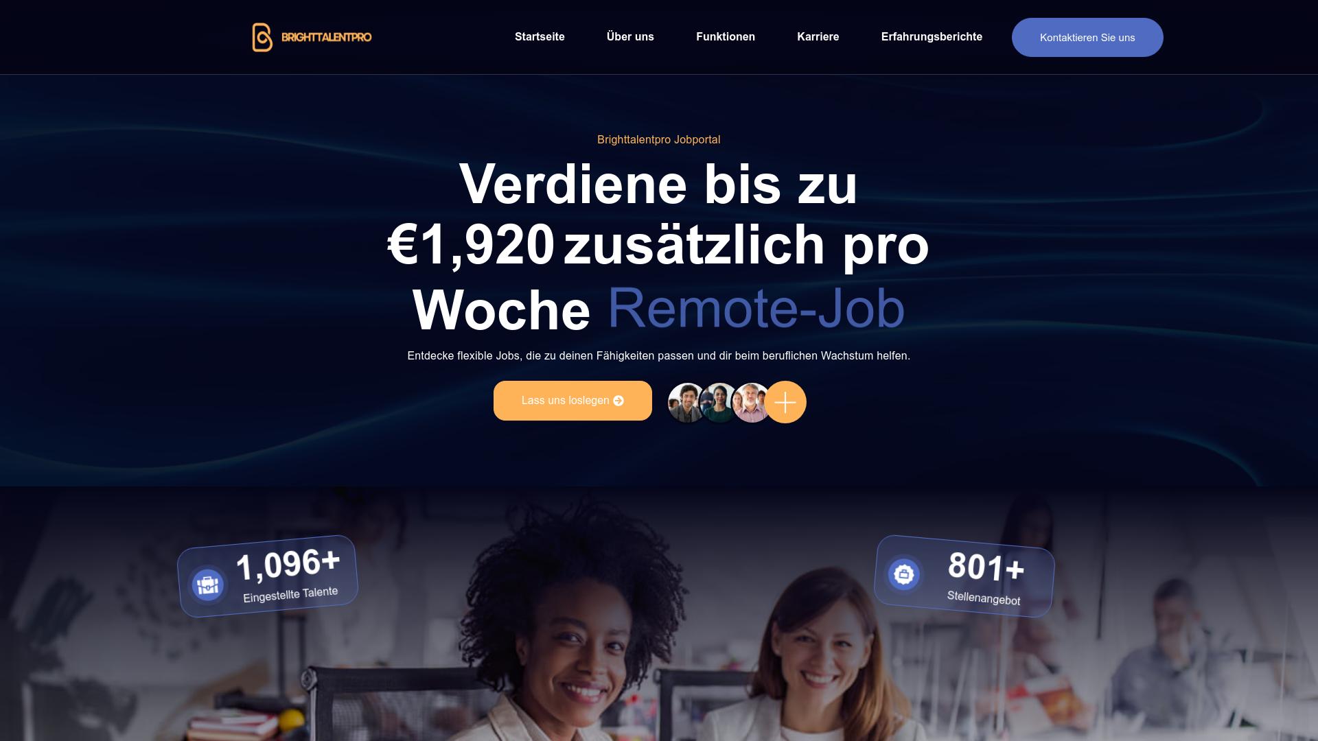 Die Webseite „BrightTalentPro“ präsentiert sich als ein Jobportal, das sich auf die Vermittlung von Remote-Jobs spezialisiert hat. Die Hauptaussage der Seite deutet darauf hin, dass Nutzer die Möglichkeit haben, bis zu 1.920 Euro zusätzlich pro Woche zu verdienen. Im Fokus stehen flexible Arbeitsangebote, die angeblich zu den individuellen Fähigkeiten der Nutzer passen und deren berufliches Wachstum unterstützen sollen. Auf der Startseite wird die Zahl von über 1.096 erfolgreich eingestellten Talenten angeführt, was darauf hinweist, dass bereits eine Anzahl von Nutzern über die Plattform Jobs gefunden haben. Des Weiteren wird angegeben, dass mehr als 801 Stellenangebote verfügbar sind, was eine breite Auswahl an Jobs impliziert. Die Benutzeroberfläche der Webseite scheint modernen Designprinzipien zu folgen, mit einem dunklen Hintergrund, der durch helle Schriftzüge und Icons ergänzt wird. Die Navigation auf der Webseite umfasst mehrere Menüpunkte, darunter „Startseite“, „Über uns“, „Funktionen“, „Karriere“ und „Erfahrungsberichte“. Diese Bereiche könnten potenziellen Nutzern weitere Informationen über die Dienstleistungen des Portals, die Funktionsweise sowie Erfahrungen anderer Nutzer liefern. Es wird außerdem ein Kontaktbereich angeboten, durch den Nutzer möglicherweise Unterstützung erhalten können. Inhaltlich betont die Webseite die Vorteile der Arbeitsflexibilität und die Möglichkeit, zusätzliche Einkünfte zu generieren. Dies könnte besonders für Personen von Interesse sein, die in der aktuellen Arbeitsmarktsituation ein zusätzliches Einkommen anstreben oder Flexibilität in ihrer Jobgestaltung suchen. Der Fokus auf Remote-Arbeit spiegelt einen Trend wider, bei dem immer mehr Arbeitgeber und Arbeitnehmer die Vorteile der Telearbeit schätzen. Die Website enthält weder spezifische Informationen zu den Typen von Stellenangeboten noch zu den Arbeitgebern, die hinter diesen Angeboten stehen. Die genauen Modalitäten, wie Interessierte sich um die angebotenen Positionen bewerben können, bleiben ebenfalls ungenannt. Es wird jedoch auf einen Button verwiesen, der mit dem Text „Lass uns loslegen“ versehen ist, was darauf hindeutet, dass Nutzer durch einen Klick in den Bewerbungsprozess einsteigen können. Zusammenfassend lässt sich sagen, dass die Webseite BrightTalentPro sich als Plattform für die Suche nach Remote-Jobs präsentiert, wobei sowohl die Anzahl offener Stellen als auch die Möglichkeit, wöchentlich ein zusätzliches Einkommen zu erzielen, betont werden.