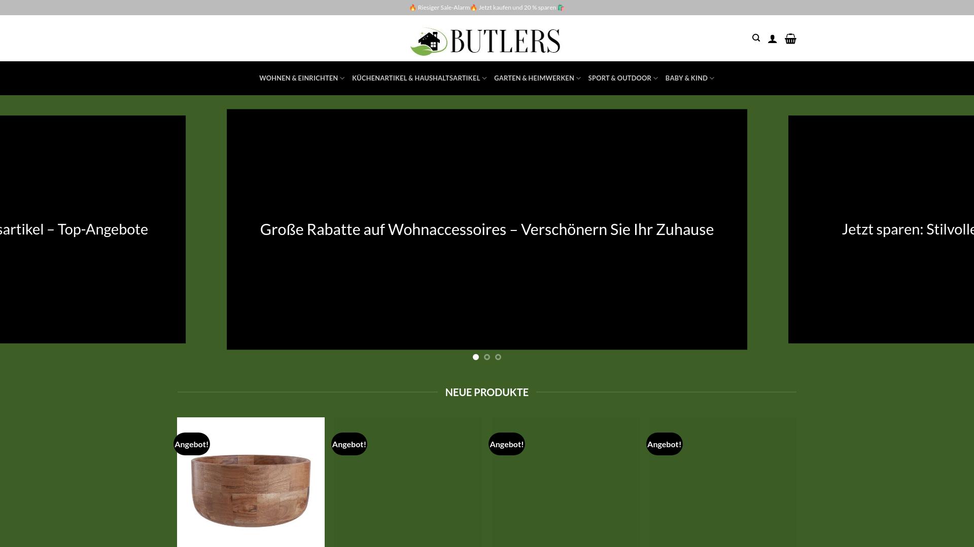 Die Webseite Butlers bietet eine Vielzahl von Produkten in den Bereichen Wohnen und Einrichten an. Auf der Plattform finden sich diverse Artikel, die für die Gestaltung von Wohnräumen sowie für die Nutzung im Garten und im Outdoor-Bereich geeignet sind. Zu den Hauptkategorien zählen Wohnaccessoires, Küchenartikel, Haushaltsartikel und Gartenbedarf. Die Seite hebt aktuelle Rabatte und Angebote hervor, welche potenziell die Preisattraktivität für die Käufer erhöhen. Im Bereich „Neue Produkte“ werden regelmäßig frische Artikel präsentiert, was darauf hindeutet, dass das Sortiment oft aktualisiert wird. Die Webseite zeigt eine Kombination aus dekorativen und funktionalen Wohngegenständen. Hierzu zählen unter anderem Möbel, Geschirr, Aufbewahrungslösungen und verschiedene Dekorationsartikel. Auch Produkte für die Teeküche sowie Küchenhelfer sind Teil des Angebots. Diese Produkte variieren in Design und Funktionalität, um unterschiedlichen Geschmäckern und Bedürfnissen gerecht zu werden. Der Gartenbereich umfasst Artikel, die sowohl für die Verschönerung als auch für die praktische Nutzung im Außenbereich gedacht sind. Hierzu zählen Gartenwerkzeuge und Zubehör, Pflanzgefäße, sowie verschiedene Outdoor-Möbel. Besucher der Webseite können durch eine benutzerfreundliche Navigation die Kategorien ansteuern, um gezielt nach spezifischen Produkten zu suchen. Des Weiteren bietet die Seite Funktionen zur Anzeige von aktuellen Sonderangeboten und Rabattaktionen, um potenzielle Käufer auf attraktive Preisnachlässe hinzuweisen. Insgesamt präsentiert die Webseite eine Sammlung von Waren, die in verschiedenen Wohn- und Lebensbereichen eingesetzt werden können. Es findet sich eine visuell ansprechende Aufmachung, die den Nutzern ein schnelles Finden der gesuchten Artikel ermöglichen soll. Auch Informationen zu jeweiligem Sonderangeboten werden prominent dargestellt.