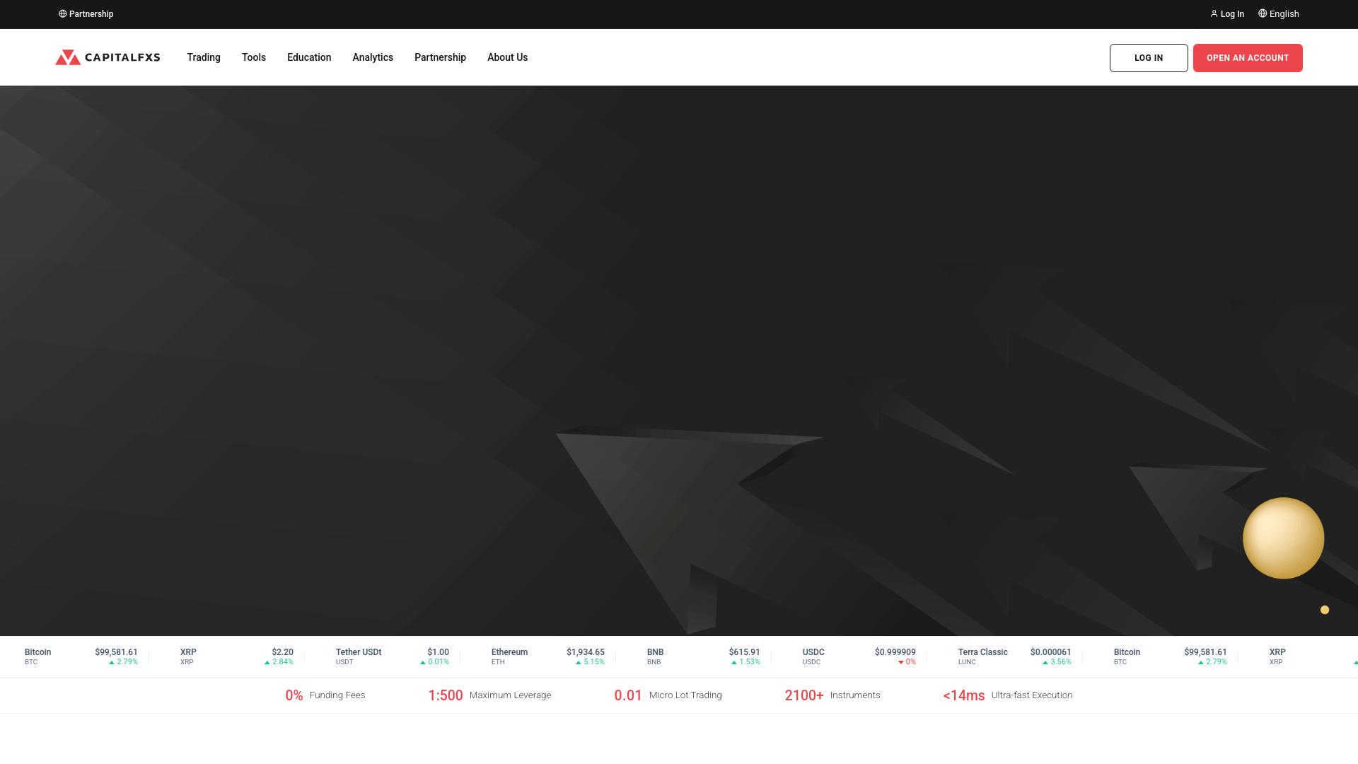 Die Webseite „CapitalFXS“ bietet Informationen und Dienstleistungen im Bereich des Online-Tradings. Auf der Hauptseite werden aktuelle Preise von verschiedenen Kryptowährungen angezeigt, darunter Bitcoin, Ethereum, XRP, und Tether. Die dargestellten Werte umfassen den jeweiligen Preis und die prozentuale Veränderung im Vergleich zum vorherigen Zeitraum. Die Webseite erwähnt eine maximale Hebelwirkung von 1:500, was potenziellen Tradern die Möglichkeit gibt, mit einem viel größeren Kapitalbetrag zu handeln, als sie tatsächlich investiert haben. Es wird zudem auf die Möglichkeit des Handels mit Mikro-Lots hingewiesen, die bei einem Wert von 0,01 beginnen. Dies könnte für Nutzer von Interesse sein, die mit geringeren Beträgen handeln möchten. Im unteren Bereich der Webseite wird zudem darauf hingewiesen, dass es keine Finanzierungskosten gibt, was Trader anziehen könnte, die daran interessiert sind, Gebühren zu minimieren. Die Seite bietet auch eine große Auswahl an handelbaren Instrumenten, die mit über 2100 Produkten angegeben wird. Zusätzlich wird auf die Schnelligkeit der Ausführung hingewiesen, wobei eine schnelle Ausführung von unter 14 Millisekunden angegeben wird. Dies kann für erfahrene Trader von Bedeutung sein, die auf kurzfristige Marktentwicklungen reagieren müssen. Die Webseite enthält außerdem verschiedene informative Sektionen, wie z. B. „Tools“, „Education“ und „Analytics“, die möglicherweise weiterführende Informationen, Bildungsressourcen und Analysewerkzeuge für Trader bereitstellen. Unter „Partnership“ gibt es möglicherweise Programme für Affiliate-Partner oder andere Kooperationsmöglichkeiten. Insgesamt stellt die Webseite eine Plattform dar, die auf den Handel mit Kryptowährungen und andere Finanzinstrumente fokussiert ist, mit spezifischen Angeboten, Konditionen und Dienstleistungen, die potenzielle Nutzer ansprechen könnten.