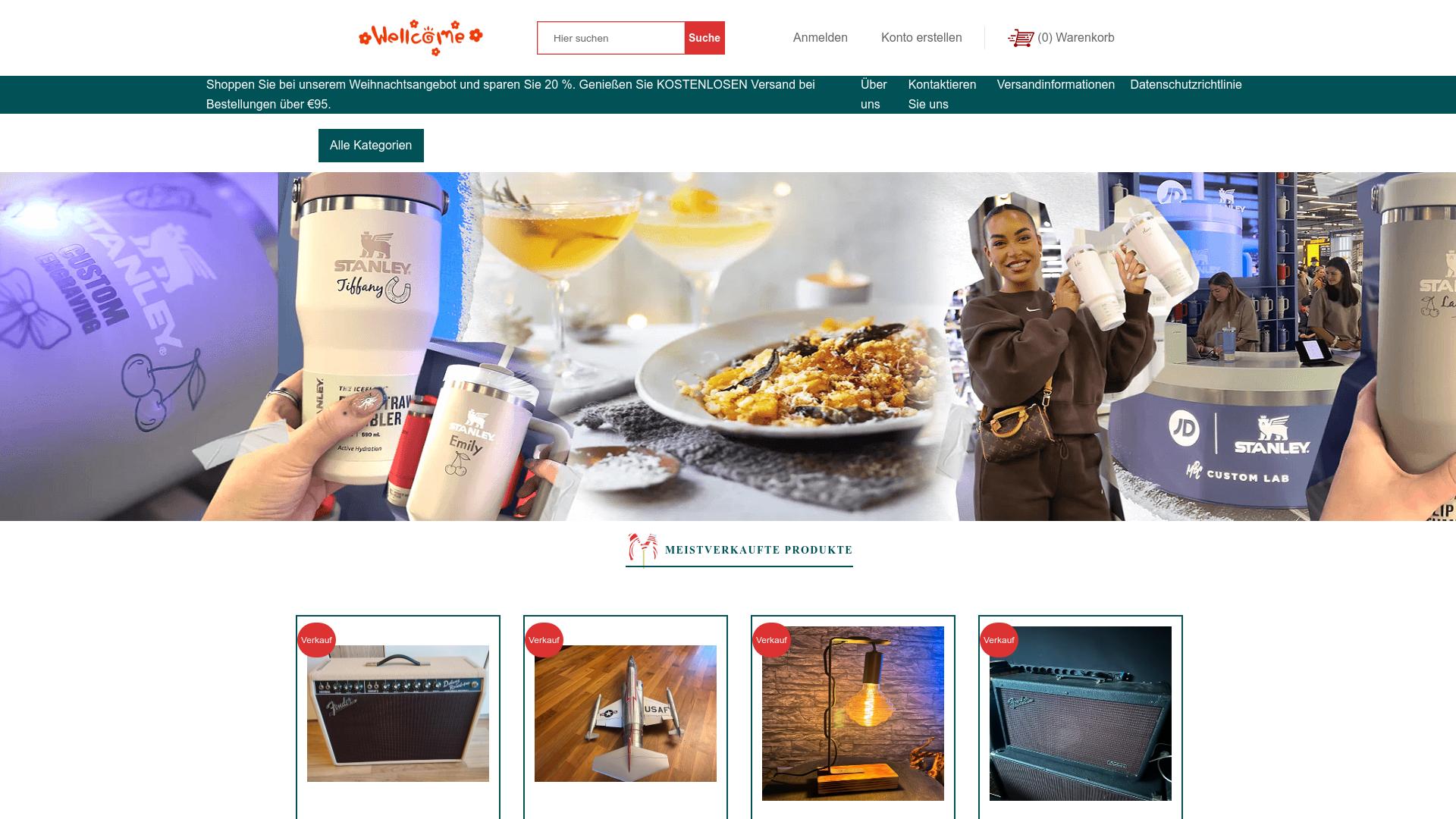 Die Webseite bietet eine Vielzahl von Produkten an, die in verschiedenen Kategorien eingeteilt sind. Im oberen Bereich ist ein Weihnachtsangebot hervorgehoben, bei dem Nutzer bis zu 20 % sparen können. Zudem wird kostenloser Versand für Bestellungen über 95 Euro angeboten. Ein zentrales Element der Seite ist die Präsentation von Trinkbehältern und Zubehör, insbesondere von der Marke Stanley. Dies umfasst personalisierte Trinkbecher mit Namen und Designs. Es sind diverse Trinkgefäße verfügbar, die für unterschiedliche Anlässe gedacht sind. Zusätzlich sind auf der Webseite weitere Produkte aufgeführt, die in einer Galerie dargestellt werden. Diese umfassen unter anderem Elektronikartikel wie Verstärker, sowie dekorative Elemente wie Lampen und Spielzeugmodelle, die für Sammler von Interesse sein könnten. Die Webseite verwendet ansprechende Bilder, um die angebotenen Artikel in einem realistischen Kontext zu präsentieren, was darauf abzielt, die Funktionalität und Anwendung der Produkte zu verdeutlichen. Ein Abschnitt befasst sich mit den meistverkauften Produkten, was eine Auswahl von Artikeln zeigt, die möglicherweise hohe Nachfrage haben. Es gibt auch Optionen zur Kontaktaufnahme sowie Informationen zu Zahlungs- und Versandmöglichkeiten. Die Gestaltung der Seite ist übersichtlich, und die Kategorien sind leicht zugänglich, was eine einfache Navigation ermöglichen soll. Insgesamt vermittelt die Webseite ein breites Sortiment an Konsumgütern, die alltägliche Verwendung finden können, neben gelegentlichen Angeboten und Aktionen, die für Käufer ansprechend sein könnten.