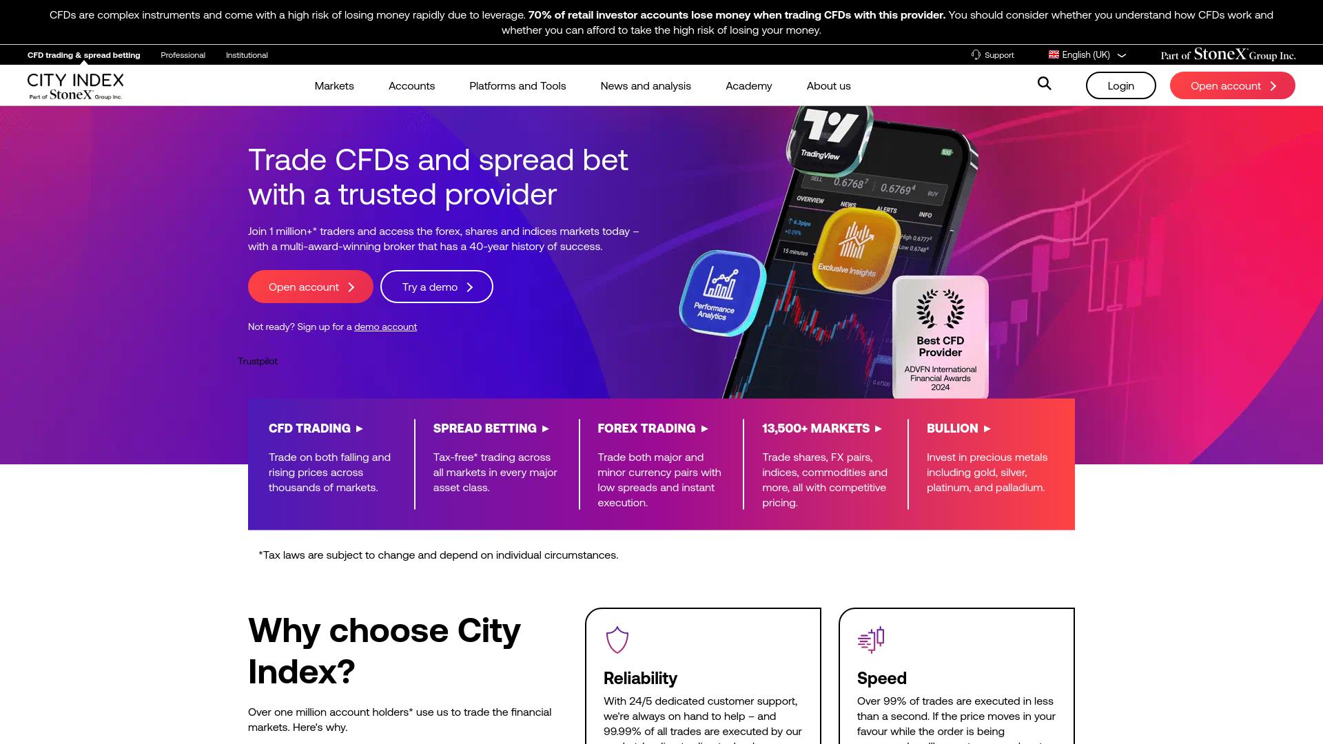 Die Webseite „City Index“ bietet eine Plattform für den Handel mit Contracts for Difference (CFDs) und Spread-Wetten. Nutzer können auf eine Vielzahl von Märkten zugreifen, die über 13.500 verschiedene Optionen umfassen, darunter Aktien, Devisen und Rohstoffe. Die Seite hebt die Möglichkeit hervor, sowohl auf steigende als auch auf fallende Kurse zu spekulieren und verspricht eine schnelle Ausführung von Aufträgen. Ein zentraler Bestandteil des Angebots ist der Handel mit Devisen, wo sowohl Haupt- als auch Nebenwährungspaare verfügbar sind. Zudem wird eine Steuerfreiheit beim Spread-Betting in Ansicht gebracht, wobei die genauen steuerlichen Bedingungen je nach individuellen Umständen variieren können. Die Webseite stellt auch verschiedene Funktionen zur Unterstützung des Handels bereit. Dazu gehören analytische Werkzeuge, die Einblicke in Marktentwicklungen und Handelsperformance bieten. Außerdem wird die Möglichkeit erwähnt, ein Demokonto zu eröffnen, um die Plattform und die Handelswerkzeuge risikofrei auszuprobieren. Die Plattform richtet sich sowohl an professionelle als auch an institutionelle Trader und betont ihre Kundendienstangebote mit durchgehendem Support. Es wird darauf hingewiesen, dass täglich eine Vielzahl von Trades ausgeführt wird, wobei mehr als 99 % der Aufträge innerhalb einer Sekunde abgewickelt werden sollen. Zusätzlich wird das Angebot für den Handel mit Edelmetallen beschrieben, darunter Gold, Silber, Platin und Palladium. Dies fällt unter den Bereich „Bullion“, was darauf hinweist, dass die Nutzer auch in physische Waren investieren können. Insgesamt bietet die Webseite eine umfassende Sammlung von Finanzinstrumenten und Handelstools für verschiedene Nutzerbedürfnisse. Einzelheiten zu den Kontowährungen und spezifischen Handelsbedingungen sind ebenfalls vorhanden, einschließlich möglicher Gebühren, die bei den Transaktionen anfallen können.