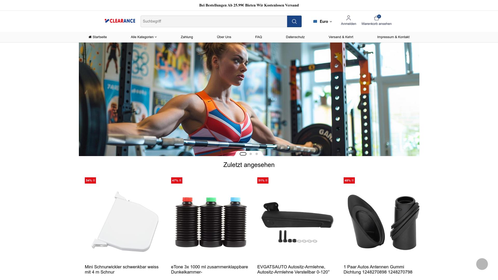 Die Webseite, die hier beschrieben wird, präsentiert sich als Online-Shop, der eine Vielzahl von Produkten in verschiedenen Kategorien anbietet. Die Startseite zeigt eine auffällige Grafik, die möglicherweise im Zusammenhang mit Fitness oder Sport steht, wobei eine Person in sportlicher Kleidung zu sehen ist. Dies kann darauf hindeuten, dass Fitness- oder Sportartikel ein Teil des Angebots sind. In der unteren Hälfte der Seite sind mehrere Produkte aufgelistet, die anscheinend zuletzt angesehen wurden. Diese Produkte umfassen verschiedene Artikel, die offensichtlich für unterschiedliche Verwendungszwecke gedacht sind. Dazu gehört ein mini Schnurwickler, dieser ist laut Beschreibung schwenkbar und kommt mit einer Schnur von vier Metern. Ein weiteres Produkt sind drei zusammenklappbare Dunkelkammer-Flaschen, die jeweils eine Kapazität von 1000 ml haben. Des Weiteren wird eine Autositz-Armlenie angeboten, die verstellbar ist und für eine Positionierung von 0-120 Grad geeignet ist. Auch ein Paar Gummidichtungen für Autantennen wird als Produkt angeboten. Zusätzlich sind Preisreduzierungen in Prozent angegeben, was darauf hinweist, dass die Angebote möglicherweise zeitlich begrenzt sind oder saisonale Rabatte bieten. Es wird auch auf eine kostenlose Versandoption hingewiesen, die für Bestellungen ab einem bestimmten Betrag gilt. Die Webseite enthält Links zu verschiedenen Bereichen wie Zahlung, häufige Fragen (FAQ) und Datenschutzbestimmungen, was darauf hindeutet, dass sie grundlegende Informationen zur Abwicklung von Transaktionen und zum Schutz der Privatsphäre der Nutzer bereitstellt. Insgesamt ist die Seite vielseitig gestaltet und bietet eine Auswahl an Alltagsprodukten, die in verschiedenen Kategorien eingeordnet sein könnten. Die Darstellung der Produkte ist visuell ansprechend, mit einem klaren Fokus auf die angebotenen Waren.