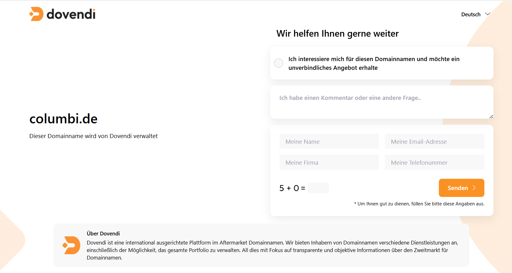 Die Webseite columbi.de wird von der Firma Dovendi verwaltet. Auf der Seite wird der Nutzer darüber informiert, dass der genannten Domainname in den Verantwortungsbereich von Dovendi fällt. Es wird ein Kontaktformular angeboten, das es Nutzern ermöglicht, eine Anfrage zu stellen. Die Auswahlmöglichkeiten im Formular umfassen das Interesse an einem unverbindlichen Angebot für den Domainnamen sowie die Möglichkeit, Kommentare oder andere Fragen zu unterbreiten. Nutzer werden gebeten, ihren Namen, die E-Mail-Adresse sowie die Telefonnummer anzugeben, um ihre Anfrage zu vervollständigen. Zusätzlich ist ein mathematisches Feld vorhanden, das zur Überprüfung der Eingabe dient. Die Webseite weist darauf hin, dass Dovendi eine internationale Plattform für Aftermarket-Domainnamen ist, die verschiedene Dienstleistungen für Domaininhaber bereitstellt. Diese Dienstleistungen sind offenbar darauf ausgelegt, das gesamte Portfolio von Domainnamen zu verwalten. Die Informationen auf der Webseite betonen den Fokus auf transparente und objektive Informationen über den Sekundärmarkt für Domainnamen. Es gibt jedoch keine spezifischen Details über die angebotenen Dienstleistungen oder Produkte selbst, außer dass sie sich auf den Handel oder die Verwaltung von Domainnamen beziehen. Die Gestaltung der Seite wirkt schlicht und benutzerfreundlich, mit einem klaren Aufruf zur Interaktion über das Kontaktformular. Insgesamt bietet die Webseite eine Plattform zur Kontaktaufnahme für Interessierte an dem Domainnamen, ohne zusätzliche Informationen zu spezifischen Bedingungen oder Angeboten zur Verfügung zu stellen. Die Nutzer werden somit aufgefordert, ihre Anfragen direkt an Dovendi zu richten, um weitere Informationen zu erhalten. Es wird keine andere Art von Produkten oder Dienstleistungen außerhalb der Verwaltung oder des Handels von Domainnamen beschrieben.