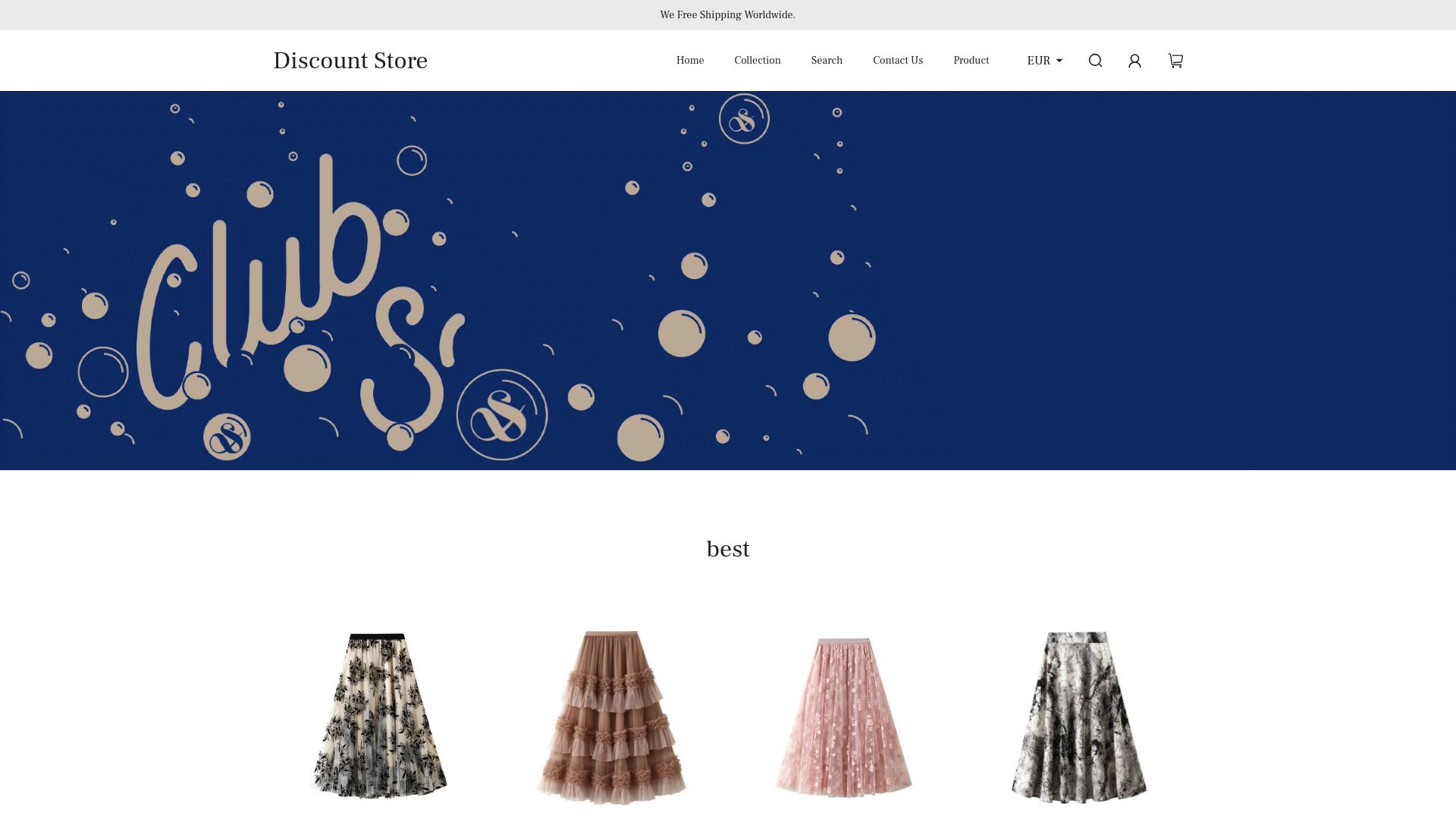 Die Webseite „Discount Store“ bietet eine Auswahl an Bekleidungsartikeln, insbesondere Damenröcken. Auf der Startseite werden mehrere Röcke in unterschiedlichen Stilen und Farben angezeigt. Die Präsentation der Produkte erfolgt in einer übersichtlichen Galerie, die verschiedene Designs zeigt, darunter farbige Tüllröcke sowie Modelle mit floralen Mustern. Unter den dargestellten Artikeln ist eine Vielzahl an Texturen und Schnitten zu finden, was darauf hindeutet, dass die Kollektion ein breites Spektrum an modischen Optionen abdeckt. Die Navigation erfolgt über ein einfach strukturiertes Menü, das Zugang zu verschiedenen Bereichen der Webseite wie „Home“, „Collection“, „Search“, „Contact Us“ und „Product“ bietet. Zudem wird die Möglichkeit angeboten, die Währung auf Euro zu ändern. Ein hervorstechendes Merkmal der Webseite ist der Hinweis auf weltweiten kostenlosen Versand, was potenziell für internationale Kunden von Interesse sein könnte. Es gibt auch eine Funktion zur Produktsuche, die es den Nutzern ermöglicht, gezielt nach bestimmten Artikeln zu suchen. Die Webseite hat ein modernes Design mit einer dunklen Farbpalette und ansprechenden Grafiken, die den visuellen Eindruck unterstützen. Es ist jedoch unklar, ob eine umfangreiche Markenidentität oder Unternehmensgeschichte vorhanden ist, da die Informationen zu den Anbietern und den hinter der Webseite stehenden Personen oder Organisationen nicht ersichtlich sind. Insgesamt bietet die Webseite eine Plattform für den Online-Verkauf von Damenmode, fokussiert auf Röcke, mit grundlegenden E-Commerce-Funktionen, um den Einkauf zu erleichtern. Die Benutzeroberfläche ist funktional, und das Design zielt darauf ab, eine einladende Einkaufsumgebung zu schaffen.