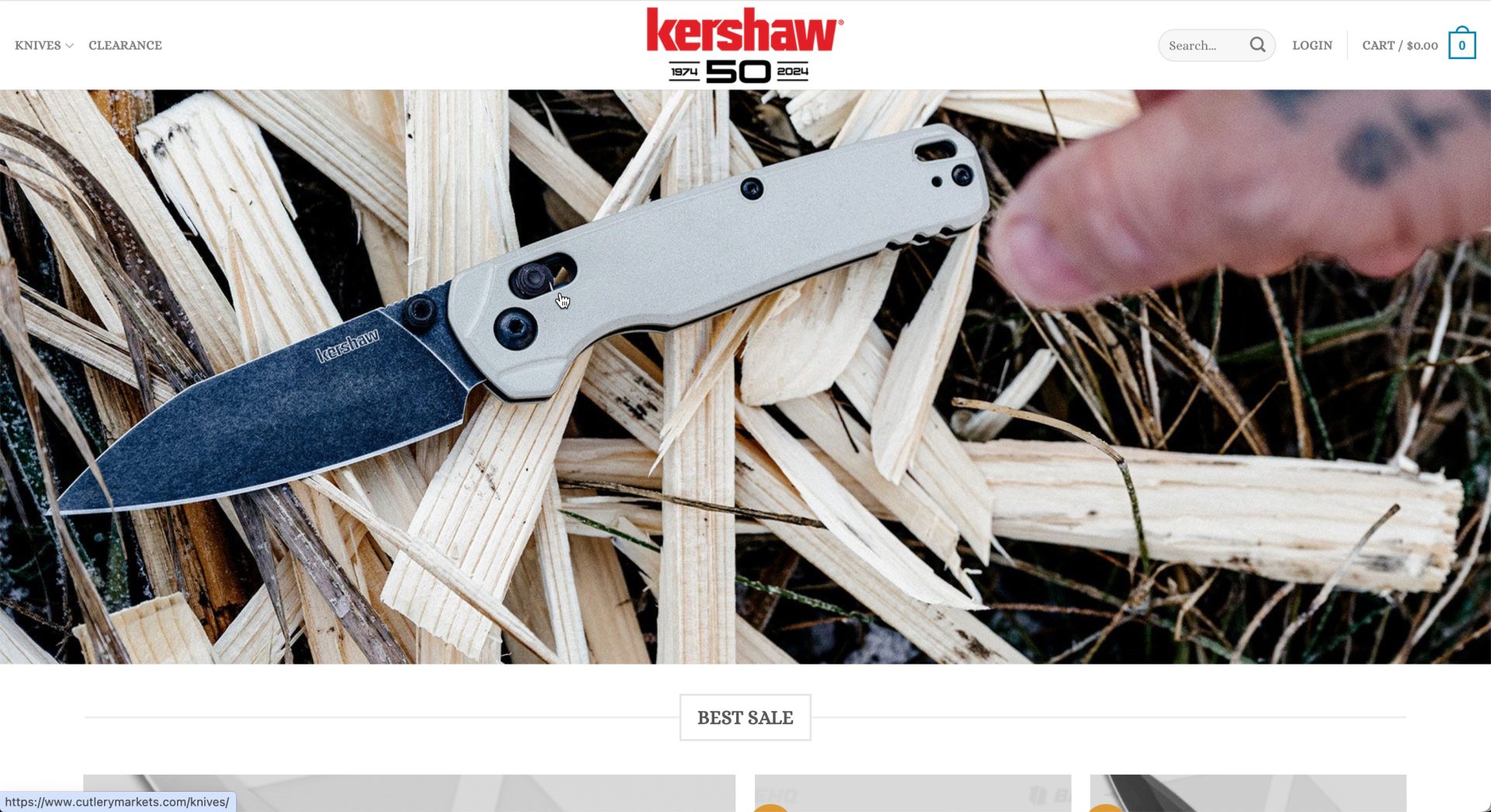 Die Webseite bietet eine Auswahl an Messern, die unter der Marke Kershaw vermarktet werden. Im oberen Bereich der Seite gibt es ein Logo, das auf das Unternehmen Kershaw hinweist, welches seit 1974 besteht und bis 2024 feiert. Die Produktpräsentation konzentriert sich auf verschiedene Arten von Klappmessern, die für unterschiedliche Anwendungen geeignet sind. In der Navigation sind Kategorien wie „Knives“ und „Clearance“ zu finden. Die Kategorie „Knives“ umfasst eine Vielzahl von Modellen, die verschiedene Eigenschaften und Designs aufweisen. Nutzer können sich über verschiedene Produktdetails informieren, wie z. B. Klingenmaterialien, Klingenformen und Mechanismen zur Öffnung der Messer. Der Bereich „Clearance“ deutet darauf hin, dass dort Angebote oder reduzierte Produkte zu finden sind. Dies könnte interessante Kaufoptionen für Verbraucher darstellen, die auf der Suche nach Schnäppchen sind. Die präsentierten Messer scheinen in stimmungsvollem Licht und auf unterschiedlichen Untergründen fotografiert zu sein, was die verschiedenen Designs und Funktionen der Produkte zur Geltung bringt. Einige Messer können ganz oder teilweise in ihrer Position perfekt genutzt werden, um die Funktionen zu demonstrieren. Zudem gibt es Produktbewertungen oder Kundenbewertungen, die den Käufern zusätzliche Informationen zur Verfügung stellen könnten. Eine Suchleiste ermöglicht es Nutzern, gezielt nach bestimmten Produkten oder Informationen zu suchen. Im Warenkorb wird die Anzahl der ausgewählten Produkte angezeigt, was auf einen E-Commerce-Bereich hinweist, in dem Verbraucher die Möglichkeit haben, die Produkte online zu erwerben. Zusammenfassend bietet die Webseite eine strukturierte Plattform zur Präsentation und zum Verkauf von Kershaw-Messern, mit einer klaren Kategorisierung von Produkten und besonderen Angeboten. Der gesamte Aufbau der Seite legt den Fokus auf die Produkte, deren Funktionen und Designs.