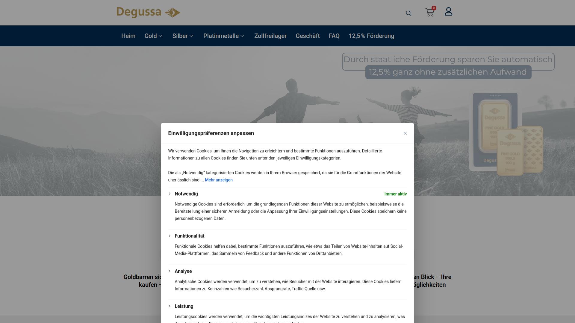 Die Webseite Degussa bietet eine Vielzahl von Produkten und Dienstleistungen im Bereich Edelmetalle an. Im Fokus stehen insbesondere Gold und Silber in verschiedenen Formen, darunter Barren und Münzen. Nutzer können Informationen zu den aktuellen Marktpreisen für Edelmetalle einsehen, die regelmäßig aktualisiert werden. Zusätzlich werden spezielle Angebote und Fördermöglichkeiten thematisiert, beispielsweise staatliche Förderungen für den Kauf von Gold, die als automatisch angesehen werden, ohne extras Aufwände. Auf der Webseite sind auch Hinweise zu den verschiedenen Arten von Edelmetallen und deren Nutzen für die Geldanlage oder als Wertaufbewahrung zu finden. Des Weiteren gibt es eine Kategorie für Platin- und Palladiumprodukte, die ebenfalls zum Portfolio gehören. Kunden können sich über die Eigenschaften und Vorzüge von Edelmetallen informieren und erhalten Unterstützung beim Kauf. Die Webseite bietet eine einfache Navigation, die es den Nutzern ermöglicht, schnell zu den gewünschten Informationen zu gelangen. Ein weiterer Aspekt der Webseite ist der Bereich für Geschäftskunden, der Dienstleistungen für Unternehmen im Zusammenhang mit Edelmetalltransaktionen umfasst. Zusätzlich wird ein FAQ-Bereich bereitgestellt, in dem häufig gestellte Fragen beantwortet werden, was die allgemeinen Informationsangebote ergänzt. Im Hinblick auf die Benutzererfahrung informiert die Seite auch über den Einsatz von Cookies, die zur Verbesserung der Navigation und Funktionalität verwendet werden. Nutzer können ihre Einwilligung zu verschiedenen Cookies anpassen, wobei grundsätzliche Cookies für den Betrieb der Webseite als notwendig eingestuft werden. Insgesamt konzentriert sich die Webseite auf den Handel und die Informationsbereitstellung im Bereich Edelmetalle, wobei sowohl Privat- als auch Geschäftskunden angesprochen werden. Die angebotenen Informationen sind darauf ausgerichtet, eine solide Grundlage für Entscheider im Bereich der Investitionen in Edelmetalle zu schaffen.