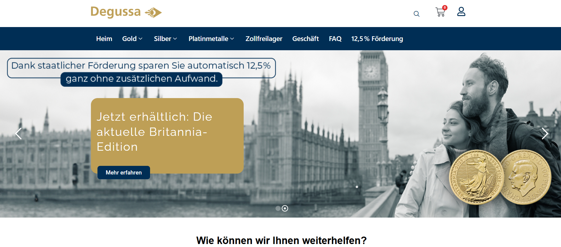Die Webseite „Degussa“ bietet eine Plattform für den Handel mit Edelmetallen, insbesondere Gold, Silber und Platin. Auf der Startseite wird ein Fokus auf staatliche Förderungen gelegt, die den Kunden ermöglichen, einen automatischen Rabatt von 12,5 % zu erhalten. Diese Förderung wird ohne zusätzlichen Aufwand in Aussicht gestellt. Unter den angebotenen Produkten sind Münzen, Barren und andere Formen von Edelmetallen zu finden. Ein spezielles Highlight der Seite ist die Erwähnung der aktuellen „Britannia-Edition“, die offenbar jüngst verfügbar gemacht wurde. Die Webseite legt somit Wert auf die Präsentation neuer und exklusiver Produkte, die für Anleger und Sammler von Interesse sein könnten. Die Benutzeroberfläche der Seite bietet verschiedene Menüoptionen wie „Gold“, „Silber“ und „Platinmetalle“, wodurch Besucher leicht durch die verschiedenen Kategorien navigieren können. Des Weiteren gibt es Bereiche, die Informationen zu Zollfreilagern und weiteren Dienstleistungen liefern. In der FAQ-Sektion werden häufige Fragen behandelt, um potenziellen Nutzern die wichtigsten Informationen bereitzustellen. Die Webseite enthält auch eine Suchfunktion sowie Optionen zur Kontaktaufnahme, um Benutzern bei weiteren Fragen oder Anliegen zu helfen. Die gewählte grafische Gestaltung zeigt eine Kombination aus visueller Ästhetik und praktischen Informationen, um den Nutzer durch den Besuch zu leiten. Insgesamt spiegelt die Struktur der Seite ein Angebot wider, das auf den Besitz und Handel von Edelmetallen fokussiert ist. Insbesondere für Anleger, die an physischen Edelmetallinvestitionen interessiert sind, könnte die Webseite als Informationsquelle dienen. Die Präsentation von Angeboten sowie die Vermittlung von Förderungsangeboten sind charakteristische Merkmale der Seite.