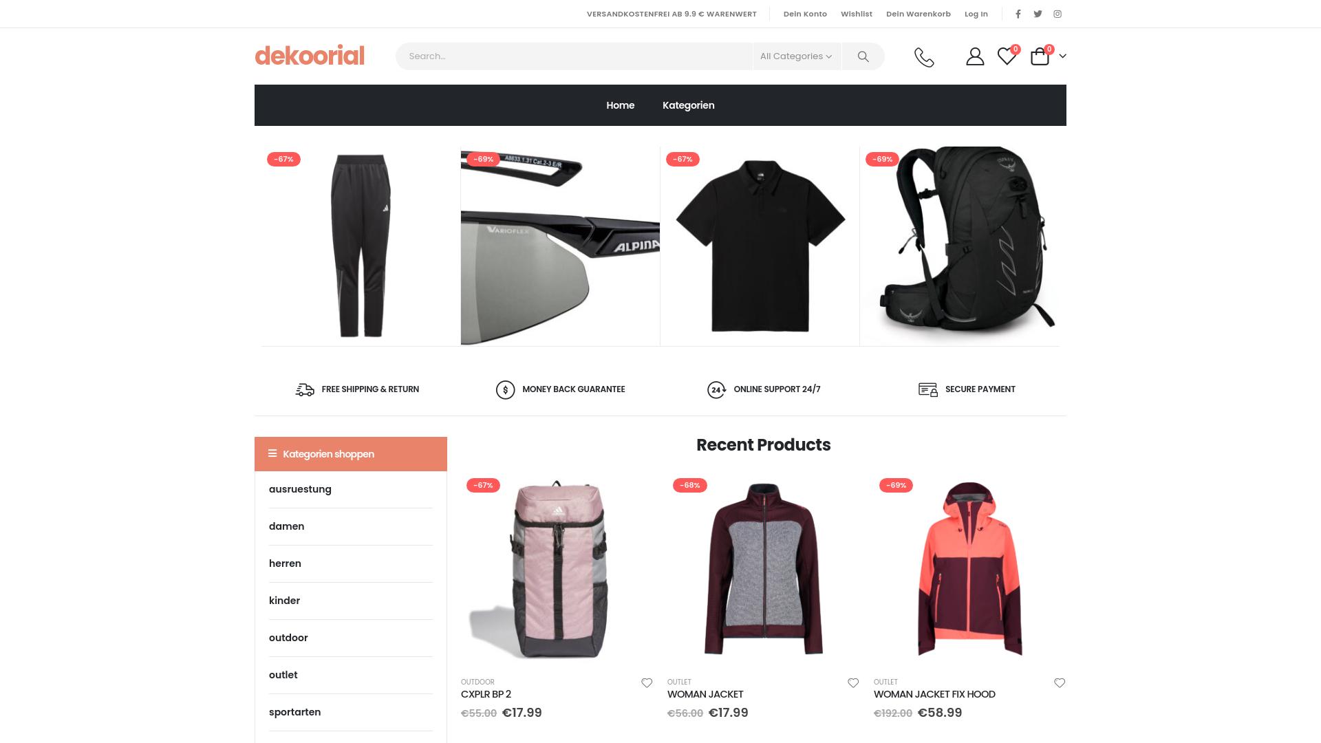 Die Webseite „dekoorial“ bietet eine Vielzahl von Produkten an, die vor allem im Bereich Sport und Outdoor-Aktivitäten angesiedelt sind. Die Hauptkategorien umfassen Ausrüstung für Damen, Herren, Kinder sowie Outdoor-Artikel. Zudem wird eine Auswahl an speziellen Sportarten angeboten. Unter dem Punkt „Recent Products“ sind verschiedene Artikel gelistet, die mit Preisnachlässen von bis zu 69% beworben werden. Zu den Produkten gehören unter anderem Sporthosen, Poloshirts, Rucksäcke, Sonnenbrillen und Jacken, die sowohl für Damen als auch für Herren konzipiert sind. Besonders hervorgehoben wird die Option für kostenlosen Versand und Rückgabe sowie eine Geld-zurück-Garantie. Die Seite weist darauf hin, dass eine Online-Unterstützung rund um die Uhr verfügbar ist, um den Nutzern bei Fragen oder Problemen behilflich zu sein. Zusätzliche Informationen umfassen Zahlungsoptionen, die als sicher beschrieben werden. Die Webseite verfügt über eine Benutzeroberfläche, die einfache Navigation ermöglicht und es den Nutzern erlaubt, gezielt nach Produkten zu suchen. Ein Warenkorb und eine Wunschliste stehen den Benutzern zur Verfügung, um ihre Einkaufserfahrung zu optimieren. Es ist zu beachten, dass auf der Webseite eine große Auswahl an Rabatten prominent dargestellt wird, was darauf hinweist, dass viele der Artikel zu reduzierten Preisen angeboten werden. Die genaue Art der Produkte und deren Preisgestaltungen könnten potenziell ein breites Publikum ansprechen, insbesondere Personen, die Interesse an Sportbekleidung und -ausrüstung haben. Insgesamt beschreibt die Webseite eine kommerzielle Plattform, die sich auf den Verkauf von Sport- und Outdoor-Produkten spezialisiert hat und den Nutzern verschiedene Vorteile wie kostenfreien Versand und umfangreiche Unterstützung bietet.