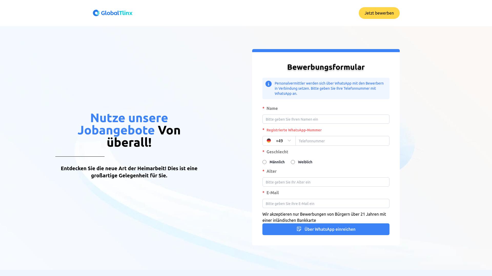 Die Webseite „GlobalTlinx“ bietet Nutzern die Möglichkeit, sich für verschiedene Jobangebote zu bewerben, die als Heimarbeit beschrieben werden. Der Hauptfokus liegt auf der Bewerbung über ein bereitgestelltes Formular, das mehrere personenbezogene Informationen erfordert. Dazu zählen der Name, eine registrierte WhatsApp-Nummer, Geschlecht, Alter und eine E-Mail-Adresse. Das Bewerbungsformular betont, dass persönliche Vermittler über WhatsApp mit den Bewerbern in Kontakt treten werden. Diese Vorgehensweise kann für Nutzer, die diesbezüglich Fragen oder Anliegen haben, einen direkten Kommunikationskanal darstellen. Die Webseite hebt hervor, dass für die Bewerbung eine inländische Bankkarte erforderlich ist, ebenso wie das Mindestalter von 21 Jahren. Die Formulierung auf der Seite impliziert, dass diese Art der Arbeit neue Möglichkeiten bietet, wobei eine Betonung auf der Flexibilität der Arbeitsplatzgestaltung von „überall“ liegt. Solche Texte sollen potenzielle Bewerber ansprechen, indem sie eine einfache und zugängliche Möglichkeit zur Jobsuche signalisiert. Zusätzlich ist ein Button vorhanden, der die Nutzer zur sofortigen Bewerbung auffordert. Dies könnte darauf hindeuten, dass der Prozess als schnell und unkompliziert wahrgenommen wird. Die visuelle Gestaltung der Webseite ist modern und übersichtlich gestaltet, was den Nutzern möglicherweise helfen könnte, sich leichter auf den bereitgestellten Informationen zu orientieren. Insgesamt beschreibt die Webseite GlobalTlinx ein Bewerbungsverfahren für Jobangebote im Bereich der Heimarbeit, wobei die Kommunikation über WhatsApp erfolgt. Sie legt besonderen Wert auf die Erhebung persönlicher Daten und die Erfüllung bestimmter Bedingungen für die Bewerbung.