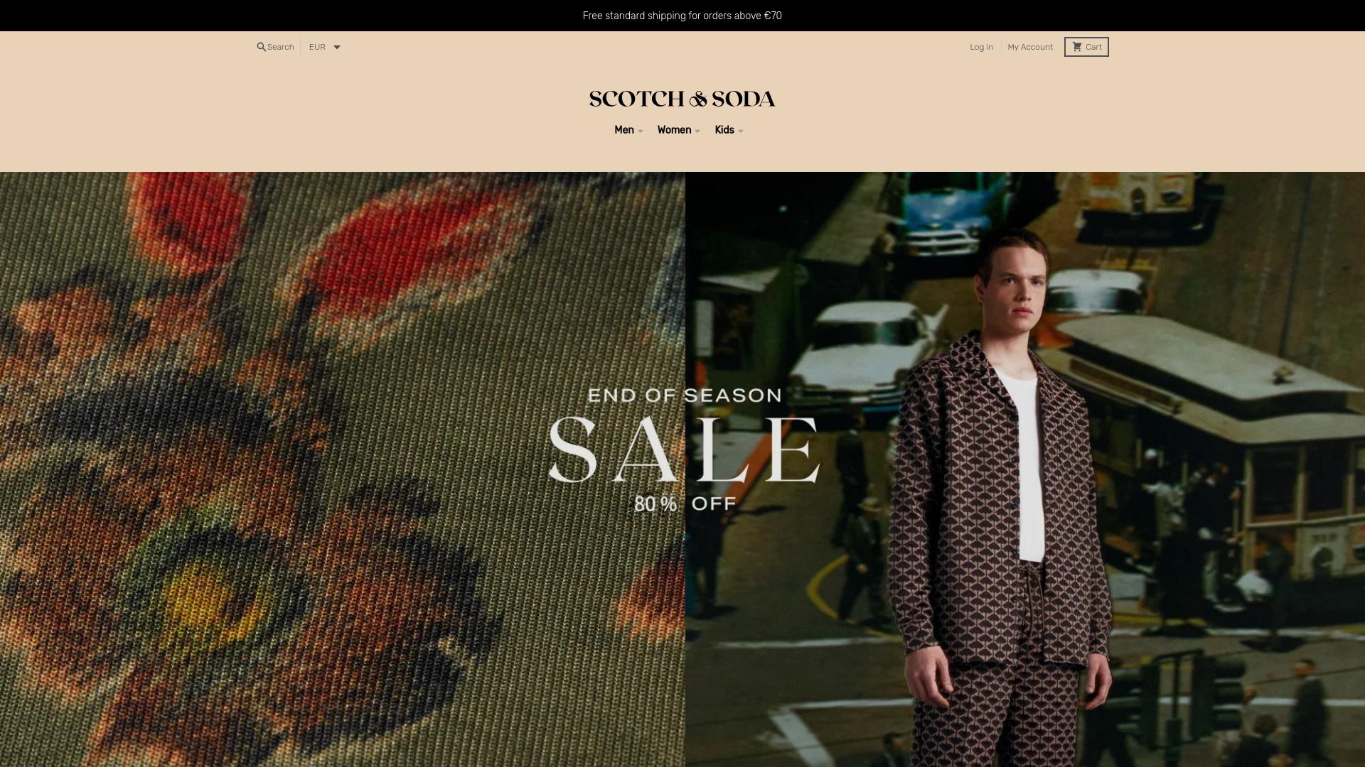 Die Webseite „Scotch & Soda“ bietet eine Vielzahl von Bekleidungsstücken für Männer, Frauen und Kinder an. Die Hauptkategorien umfassen aktuelle Kollektionen sowie Saison-Aktionen. Auf der Startseite wird ein „End of Season Sale“ hervorgehoben, der Rabatte von bis zu 80 % auf ausgewählte Produkte anbietet. Innerhalb der Kategorien „Men“, „Women“ und „Kids“ finden Nutzer eine breite Palette an Kleidung, die saisonale Trends widerspiegelt. Die Produkte scheinen von verschiedenen Stilen, und Schnitten inspiriert zu sein. Die Webseite vermittelt einen Überblick über die verfügbaren Artikel, der durch Bilder und Produktbeschreibungen ergänzt wird. Es ist ersichtlich, dass die Kleidung von unterschiedlichen Materialien und Mustern geprägt ist, was auf einen gewissen Fokus auf Design und Ästhetik hinweist. Zusätzlich gibt es Funktionen wie eine Suchleiste, die es den Besuchern ermöglicht, gezielt nach bestimmten Artikeln oder Kategorien zu suchen. Zudem wird die Möglichkeit geboten, ein Benutzerkonto zu erstellen, um Bestellungen zu verwalten. Die Webseite kommuniziert ebenfalls Informationen zu Versandbedingungen, einschließlich der Angabe, dass bei Bestellungen über einem bestimmten Betrag die Lieferung kostenlos ist. Die Produktseiten enthalten in der Regel detaillierte Informationen zu den einzelnen Artikeln, wie etwa Größen, Materialien und Pflegehinweise. Nutzer können zwischen verschiedenen Größen und eventuell Farbvarianten wählen. Zusammenfassend lässt sich sagen, dass die Webseite „Scotch & Soda“ ein umfangreiches Sortiment an Mode für verschiedene Zielgruppen bietet und durch laufende Verkaufsaktionen sowie eine benutzerfreundliche Navigation gekennzeichnet ist.