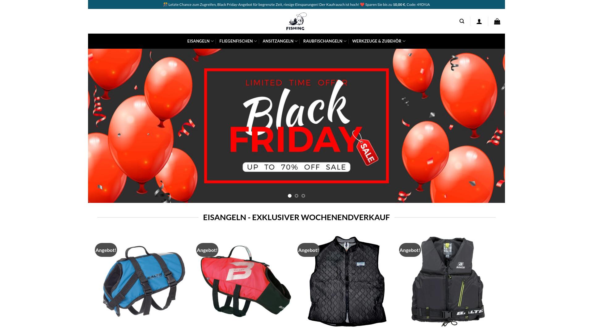 Die Webseite bietet eine Vielzahl von Produkten im Bereich Angelzubehör an. Der Schwerpunkt der Angebote liegt auf unterschiedlichen Arten von Angelgeräten, einschließlich Eisangeln, Fliegenfischen und Raubfischangeln. Zudem werden verschiedene Werkzeuge und Zubehör zur Unterstützung dieser Aktivitäten bereitgestellt. Aktuell wird auf der Seite eine Aktionsveranstaltung hervorgehoben, die im Rahmen eines Black Friday-Sales stattfinden soll. Hierbei sind Preisnachlässe von bis zu 70 % auf ausgewählte Produkte zu erwarten. Der Banner der Seite weist auf Angebote hin, die zeitlich begrenzt sind und eine Vielzahl an Artikeln des Angelzubehörs abdecken. Im unteren Bereich der Webseite sind mehrere Produkte abgebildet, die als Angebote gekennzeichnet sind. Dazu gehören unter anderem verschiedene Schwimmwesten und -jacken in unterschiedlichen Farben. Diese Produkte scheinen für den Einsatz beim Wasserangeln konzipiert zu sein, wobei spezifische Details zu den jeweiligen Modellen nicht angegeben sind. Die Webseite verfügt über eine klare Kategorisierung, die es Nutzern ermöglicht, Produkte je nach Angelart oder Zubehörart auszuwählen. Es sind Menüpunkte für verschiedene Angeldisziplinen vorhanden, die den Besuchern helfen, gezielt nach den gewünschten Produkten zu suchen. Zusätzlich wird ein Bereich für Tools und Zubehör angeboten, was darauf hindeutet, dass die Webseite ein umfassendes Sortiment für Angler bietet, um eine Vielzahl von Angelsituationen abzudecken. Die Benutzeroberfläche scheint benutzerfreundlich gestaltet zu sein, um einen einfachen Zugang zu den Informationen und Angeboten zu gewährleisten. Somit ist die Webseite ein Überblick über Angelprodukte, die aktuell im Angebot stehen, und es werden Hinweise auf spezielle Rabatte und Aktionen gegeben, um potenzielle Käufer zu informieren und zu einem Kauf zu animieren.