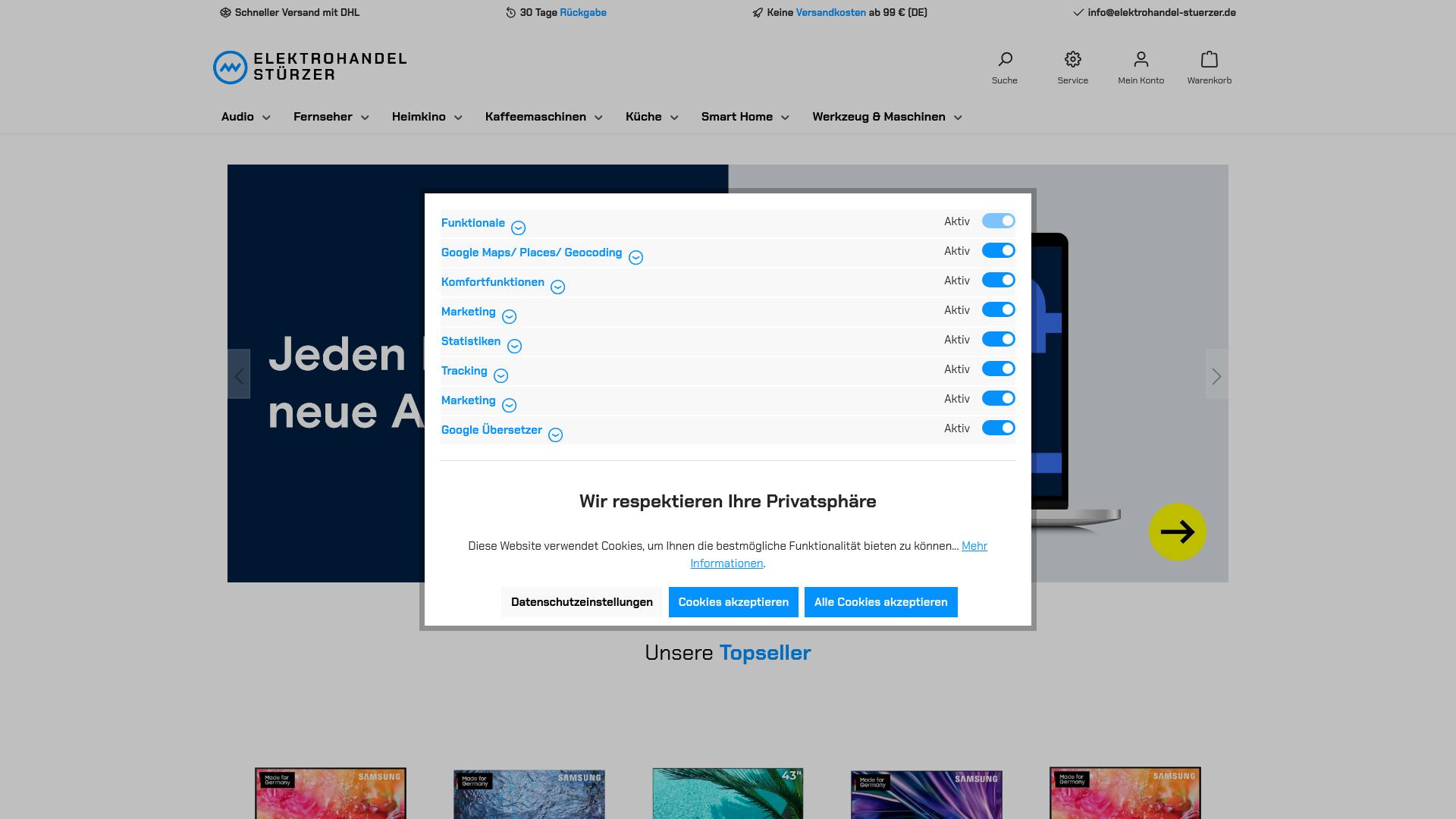 Die Webseite „elektrohandel-stuerzer.de“ bietet eine Auswahl an Elektrogeräten und -zubehör an. Die Hauptkategorien umfassen Produkte wie Audio-Geräte, Fernseher, Heimkino-Anlagen, Kaffeemaschinen, Küchenartikel, Smart Home-Technologien sowie Werkzeuge und Maschinen. Jede dieser Kategorien wird durch spezifische Produkte unterstützt, die darin aufgeführt sind. Die Seite verfügt über eine übersichtliche Benutzeroberfläche, die es Besuchern ermöglicht, gezielt nach bestimmten Artikeln zu suchen. Es werden verschiedene Marken und Modelle präsentiert, wobei eine Vielzahl von Produkten innerhalb jeder Kategorie sichtbar ist. Die Darstellung der Produkte erfolgt meist in Form von Bildern zusammen mit kurzen Beschreibungen und Preisangaben. Zusätzlich enthält die Seite Informationen zu einem Versanddienst, der schnellen Versand mit DHL anbietet sowie Hinweise zu Rückgabebedingungen, die eine 30-Tage-Rückgabeoption umfassen. Es gibt keine Angaben zu möglichen Versandkosten, die über einem bestimmten Bestellwert entfallen könnten. Des Weiteren wird eine Datenschutzerklärung prominent angezeigt, die darauf hinweist, dass die Webseite Cookies verwendet. Nutzer haben die Möglichkeit, ihre Cookie-Präferenzen über ein entsprechendes Auswahlfeld zu steuern. Zu den Daten, die erfasst werden, gehören Funktionen für Marketing, Statistiken und Tracking zur Optimierung der Nutzererfahrung. Optionen zur Verwendung von Google-Diensten wie Maps und Übersetzern sind ebenfalls verfügbar. In der Fußzeile der Webseite sind weitere Navigationsmöglichkeiten vorhanden, unter anderem ein Bereich für den Kundenservice, ein persönliches Konto und einen Warenkorb. Die Gestaltung der Webseite legt Wert auf Benutzerfreundlichkeit, um das Einkaufserlebnis zu verbessern. Zusammengefasst umfasst die Webseite eine breite Palette an Elektrogeräten und verwandten Dienstleistungen, die in Kategorien geordnet und übersichtlich dargestellt sind. Nutzer können Produkte einfach auswählen, Preise vergleichen und erhalten Informationen zu Versandoptionen sowie zur Verarbeitung ihrer Daten.