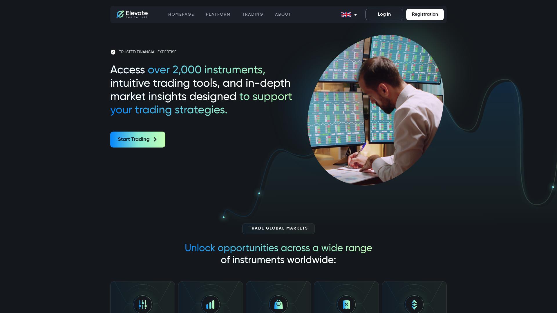 Die Webseite „Elevate Capital Ltd“ bietet Nutzern Zugang zu einer Vielzahl von Handelsinstrumenten und -tools. Nach eigenen Angaben sind über 2.000 Handelsinstrumente verfügbar, die für verschiedene Handelsstrategien genutzt werden können. Die Plattform soll intuitive Werkzeuge bereitstellen, die darauf ausgelegt sind, die Handelsstrategien der Benutzer zu unterstützen. In diesem Kontext werden auch Marktanalysen und Einblicke angeboten, die den Nutzern helfen sollen, bessere Entscheidungen zu treffen. Die Webseite hebt hervor, dass Nutzer die Möglichkeit haben, auf globale Märkte zuzugreifen. Es wird erwähnt, dass die Handelsmöglichkeiten in verschiedenen Kategorien von Instrumenten unterteilt sind, die eine breite Palette abdecken. Dazu können unter anderem Finanzinstrumente wie Aktien, Devisen, Rohstoffe und Kryptowährungen gehören. Anhand der visuellen Gestaltung der Webseite und der angebotenen Inhalte wird darauf hingewiesen, dass die Plattform modern und benutzerfreundlich gestaltet ist, um den Handelsprozess zu erleichtern. Zusätzlich enthält die Webseite einen Bereich für die Registrierung, in dem neue Nutzer Informationen zur Erstellung eines Kontos erhalten können. Auch ein Zugang für bereits registrierte Nutzer ist vorhanden, der durch ein Login-Feld gekennzeichnet wird. Die allgemeine Nutzeroberfläche scheint darauf ausgelegt zu sein, den Handelsprozess sowohl für Anfänger als auch für erfahrene Händler zu optimieren. Die Informationen auf der Webseite könnten darauf ausgerichtet sein, ein breites Publikum von Nutzern anzusprechen, die an Handelsaktivitäten interessiert sind, sei es zum Zweck des langfristigen Investments oder kurzfristigen Handels. Es wird keine spezifische Zielgruppe genannt, aber die Vielzahl der angebotenen Instrumente lässt darauf schließen, dass sowohl Einsteiger als auch Fortgeschrittene angesprochen werden könnten. Zusammenfassend lässt sich sagen, dass die Webseite „Elevate Capital Ltd“ eine Plattform für den Handel mit einer Vielzahl von Instrumenten bietet und zahlreiche Hilfsmittel zur Verfügung stellt, um den Handelsprozess zu unterstützen und zu optimieren.