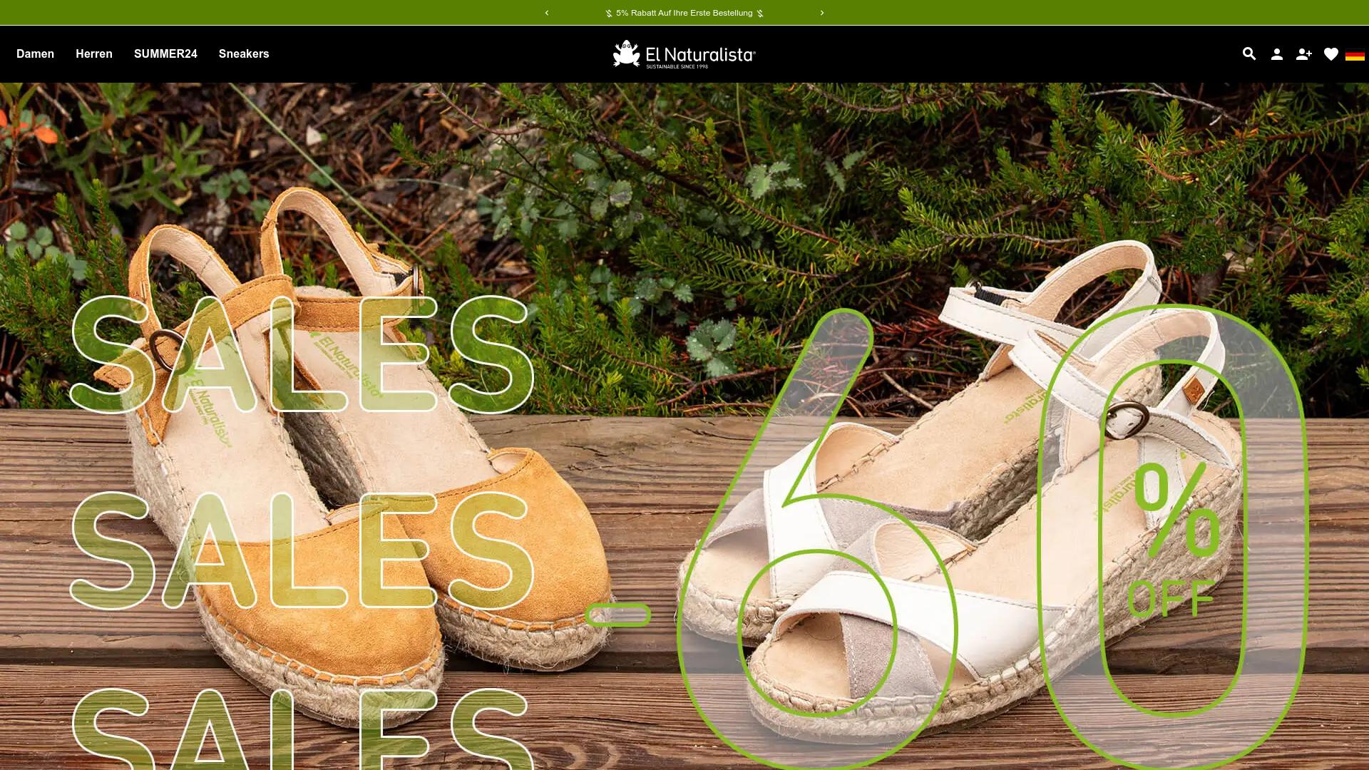 Die Webseite, die in dem Screenshot dargestellt wird, bietet hauptsächlich eine Auswahl an Schuhen. Insbesondere werden verschiedene Modelle für Damen und Herren präsentiert. Dies umfasst Sandalen und Sneakers, die offenbar in unterschiedlichen Designs und Farben erhältlich sind. Auf der Seite sind große Werbebanner platziert, die auf laufende Sales hinweisen, wobei Rabatte von bis zu 60% auf ausgewählte Produkte beworben werden. Diese Rabatte scheinen auf eine Sonderaktion hinzuweisen, die für Interessierte von Bedeutung sein könnte. Es wird auch ein Hinweis auf einen weiteren Rabatt von 5% für die erste Bestellung angezeigt, was potenziellen Neukunden Anreiz bieten könnte, ihre Einkäufe zu tätigen. Die Gestaltung der Webseite ist visuell ansprechend und nutzt eine klare, durchdachte Struktur, um die Produkte hervorzuheben. Die Bilder zeigen die Schuhe aus verschiedenen Perspektiven und in unterschiedlichen farblichen Varianten, was die Auswahl für den Kunden visualisiert. Zudem wird auf eine nachhaltige Produktion verwiesen, da der Markenname „El Naturalista“ auf einem umweltbewussten Ansatz in der Herstellung hinweisen könnte. Es wurden auch einige Kategorien erwähnt, innerhalb derer die Produkte sortiert werden können, darunter „SUMMER24“, was darauf hindeutet, dass die Webseite saisonale Angebote hat. Zusätzlich scheint die Seite eine Möglichkeit für die Nutzer zu bieten, sich über das Sortiment hinaus mit der Marke zu verbinden, was auf eine kundenorientierte Ausrichtung schließen lässt. Insgesamt ermöglicht die Webseite den Nutzern, eine Vielzahl an Schuhprodukten zu erkunden, wobei die Gestaltung und die Angebote im Vordergrund stehen. Die Präsentation der Produkte scheint klar strukturiert zu sein, um eine einfache Navigation für die Nutzer zu gewährleisten.