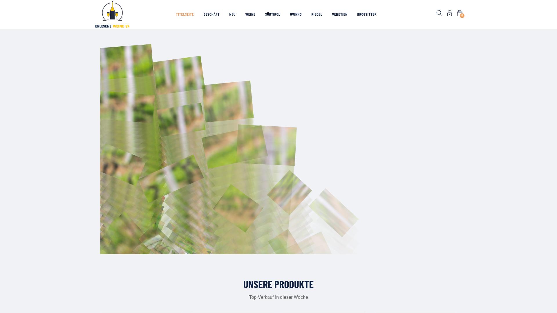 Die Webseite „Erlesene Weine 24“ präsentiert eine Auswahl an Weinen und Weinprodukten. Auf der Hauptseite wird die Kategorie „Unsere Produkte“ hervorgehoben, in der eine Übersicht über die Top-Verkäufe der Woche angezeigt wird. Es besteht eine klare Struktur, die es den Besuchern ermöglicht, verschiedene Arten von Weinen und Zubehör zu erkunden. Die Seite bietet Kategorien wie „Neu“, „Weine“, „Südtirol“, „Ovinho“, „Riedel“, „Venedien“ und „Brosgitter“. Jede dieser Kategorien scheint spezifische Produkte zu repräsentieren, die in diesen Bereichen angeboten werden. Die Verwendung von geografischen Bezeichnungen, wie Südtirol, deutet darauf hin, dass es sich möglicherweise um Weine aus speziellen Anbaugebieten handelt. Zusätzlich scheint die Webseite einige Funktionen für den Online-Einkauf zu enthalten, einschließlich eines Warenkorbsymbols und eines Kontobereichs, der den Nutzern möglicherweise die Erstellung eines Benutzerkontos oder die Anmeldung erleichtert. Dies könnte darauf hindeuten, dass Kunden die Möglichkeit haben, ihre Bestellungen zu verwalten, was für den Kauf von alkoholischen Getränken in Online-Umgebungen üblich ist. Visuelle Elemente der Webseite, wie das Hauptbild, scheinen teilweise unscharf oder verschwommen zu sein, was die Benutzererfahrung beeinträchtigen könnte. Die Navigation ist jedoch klar und ermöglicht eine einfache Suche nach spezifischen Produkten. Es gibt keine spezifischen Angaben zu Preisen oder Zahlungsoptionen auf der Hauptseite, was für potenzielle Käufer ein relevantes Kriterium sein könnte. Die Webseite könnte auch Informationen zu den einzelnen Weinen, einschließlich Bewertungen oder Herkunft, bereitstellen, obgleich dies auf der Hauptseite nicht deutlich angegeben ist. Insgesamt bietet die Webseite eine Plattform für den Verkauf von Weinen und verwandten Produkten mit einer klaren Kategorisierung, die spezifisch auf verschiedenen Weintypen und -herkünften eingeht.